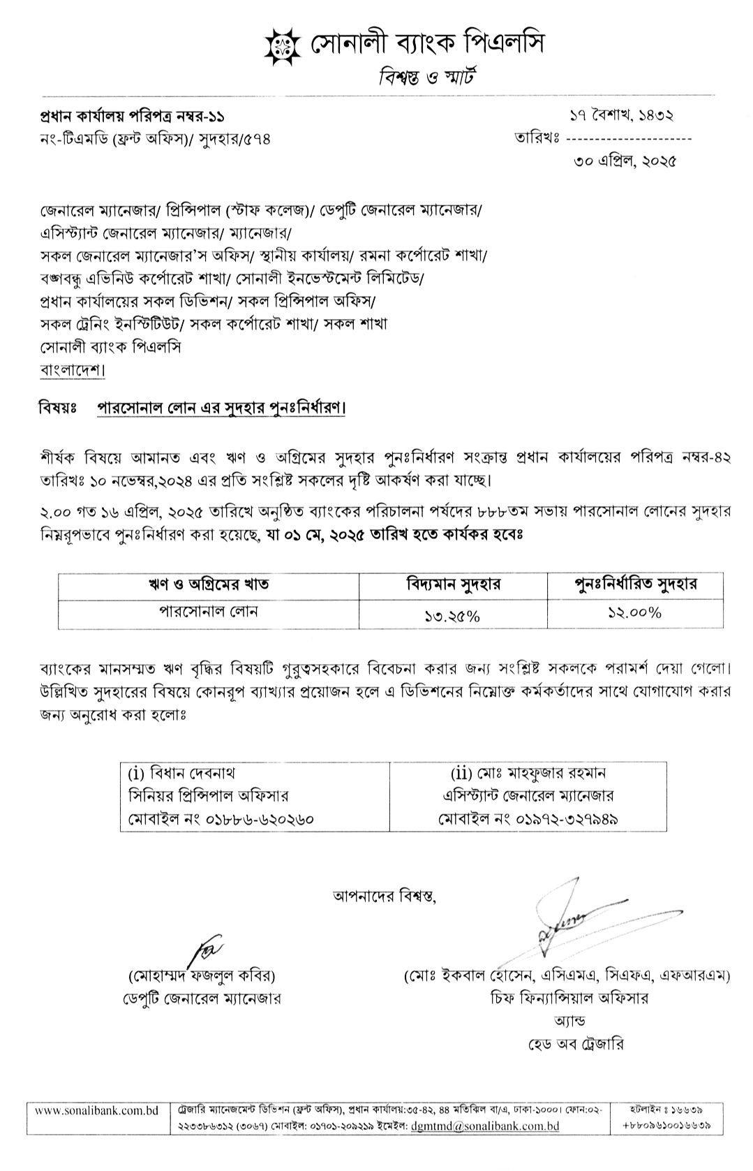 সোনালী ব্যাংক পিএলসি তাদের গ্রাহকদের জন্য ব্যক্তিগত ঋণের (Personal Loan) সুদের হার কমানোর ঘোষণা দিয়েছে। ব্যাংকের পরিচালনা পর্ষদের সাম্প্রতিক সিদ্ধান্ত অনুযায়ী, পারসোনাল লোনের বিদ্যমান সুদের হার ১৩.২৫% থেকে কমিয়ে ১২.০০% নির্ধারণ করা হয়েছে।