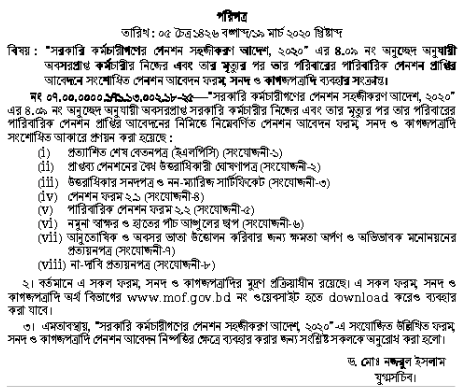 বিষয়: “সরকারি কর্মচারীগণের পেনশন সহজীকরণ আদেশ, ২০২০” এর ৪.০৯ নং অনুচ্ছেদ অনুযায়ী অবসরপ্রাপ্ত কর্মচারীর নিজের এবং তার মৃত্যুর পর তার পরিবারের পারিবারিক পেনশন প্রাপ্তির আবেদনে সংশোধিত পেনশন আবেদন ফরম, সনদ ও কাগজপত্রাদি ব্যবহার সংক্রান্ত।