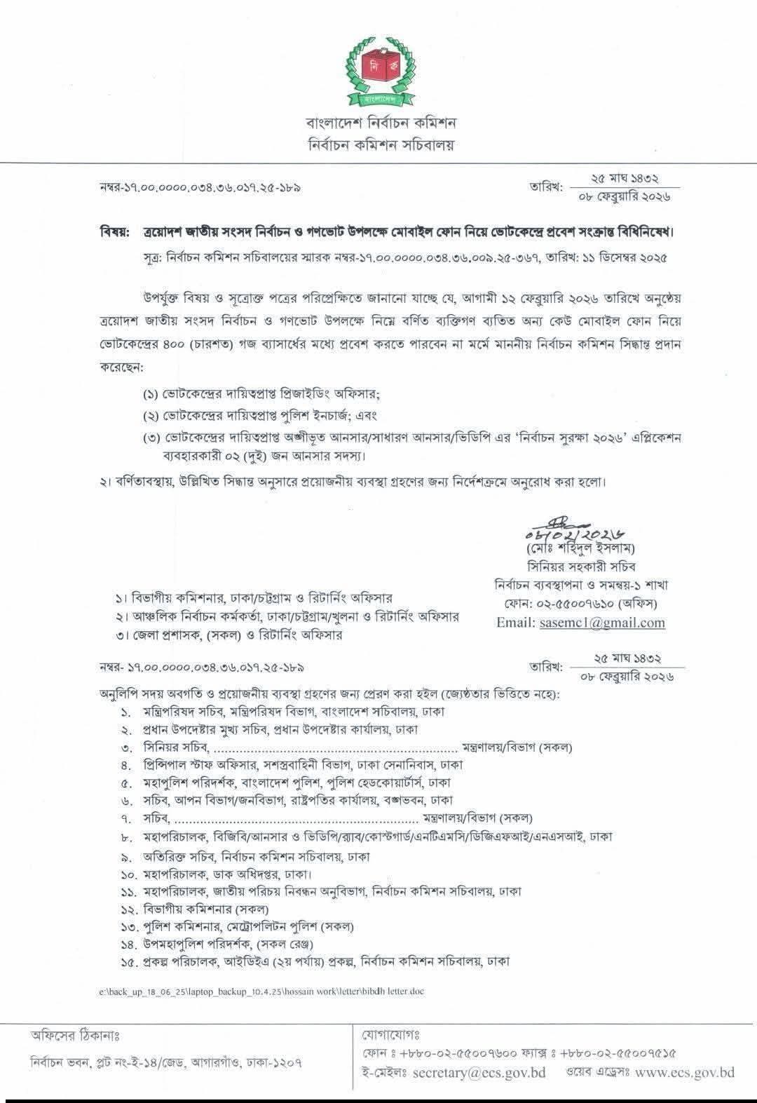 বিশেষ দ্রষ্টব্য: ভোটকেন্দ্রে দায়িত্বরত প্রিজাইডিং অফিসার এবং আইন-শৃঙ্খলা রক্ষাকারী বাহিনীর সদস্যরা ছাড়া অন্য কেউ ভোটকেন্দ্রে মোবাইল ফোন ব্যবহার করতে পারবেন না। এই নিয়ম অমান্য করলে মোবাইল ফোন জব্দসহ সংশ্লিষ্ট ব্যক্তির বিরুদ্ধে আইনানুগ ব্যবস্থা গ্রহণ করা হবে।