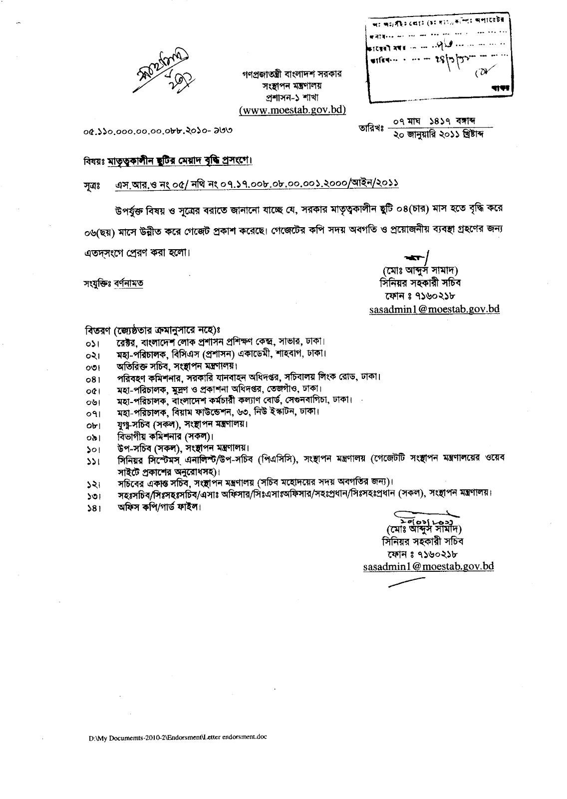 মাতৃত্বকালীন ছুটির মেয়াদ পূর্ণ বেতনে ৪ (চার) মাস হতে ৬ (ছয়) মাসে উন্নীতকরণের সুবিধা কার্যকরকরণ। সরকার ২৬ পৌষ ১৪১৭ বঙ্গাব্দ / ০৯ জানুয়ারি ২০১১ খ্রিস্টাব্দ তারিখের এস.আর.ও নং-০৫/নথি নং- ০৭.১৭৫.০০৮.০৮.০০.০০১.২০০০/আইন/২০১১। এর মাধ্যমে মাতৃত্বকালীন ছুটির মেয়াদ পূর্ণ বেতনে ৪ (চার) মাস হতে ৬ (ছয়) মাসে উন্নীত করেছে। উক্ত প্রজ্ঞাপন ০৯ জানুয়ারি ২০১১ তারিখে কার্যকর হয়েছে বিধায়, যারা এই প্রজ্ঞাপন জারীর পূর্ব থেকেই পূর্ববর্তী বিধান অনুযায়ী মাতৃত্বকালীন ছুটি ভোগরত আছেন, তাদের ক্ষেত্রে ৬ (ছয়) মাস মাতৃত্বকালীন ছুটির সুবিধা প্রদান করা হয়েছে।
