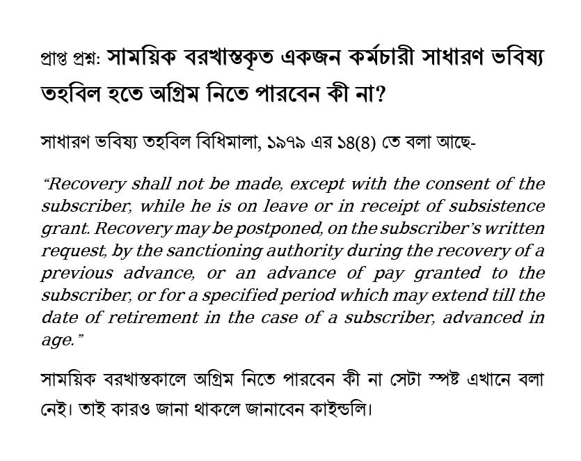 ২. অগ্রিম গ্রহণের যোগ্যতা: জিপিএফ বিধিমালা অনুযায়ী, একজন ‘সাবস্ক্রাইবার’ বা চাঁদাদাতা নির্দিষ্ট শর্ত সাপেক্ষে অগ্রিম নিতে পারেন। সাময়িক বরখাস্ত অবস্থায় তিনি টেকনিক্যালি একজন ‘সাবস্ক্রাইবার’ হিসেবেই গণ্য হন, কারণ তার সদস্যপদ বাতিল হয় না।