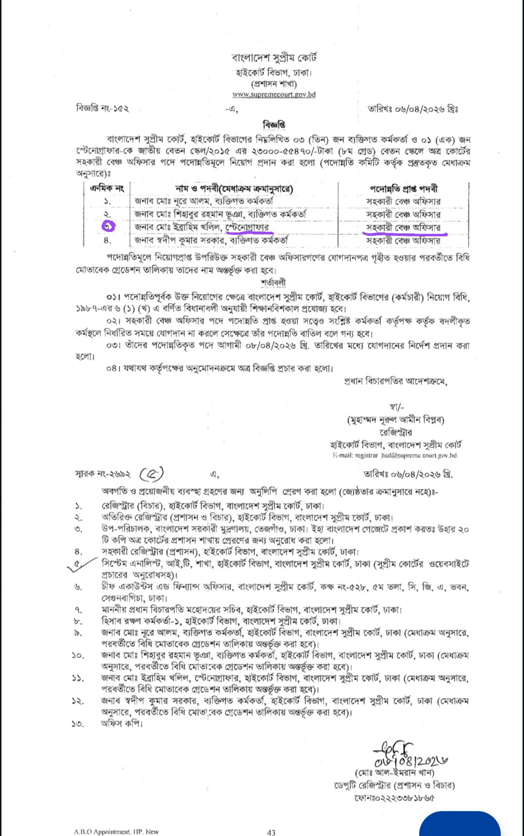 প্রকাশিত বিজ্ঞপ্তি (নম্বর- ১৫২) অনুযায়ী, হাইকোর্ট বিভাগের ০৩ (তিন) জন ব্যক্তিগত কর্মকর্তা ও ০১ (এক) জন স্টেনোগ্রাফারকে জাতীয় বেতন স্কেল ২০১৫-এর ২৩,০০০-৫৫,৪৭০/- টাকা (৮ম গ্রেড) বেতন স্কেলে ‘সহকারী বেঞ্চ অফিসার’ হিসেবে পদোন্নতি দেওয়া হয়েছে। পদোন্নতিপ্রাপ্তরা হলেন: ১. জনাব মোঃ নূরে আলম (ব্যক্তিগত কর্মকর্তা) ২. জনাব মোঃ শিশুবর রহমান ভূঞা (ব্যক্তিগত কর্মকর্তা) ৩. জনাব মোঃ ইব্রাহিম খলিল (স্টেনোগ্রাফার) ৪. জনাব স্বপন কুমার সরকার (ব্যক্তিগত কর্মকর্তা)