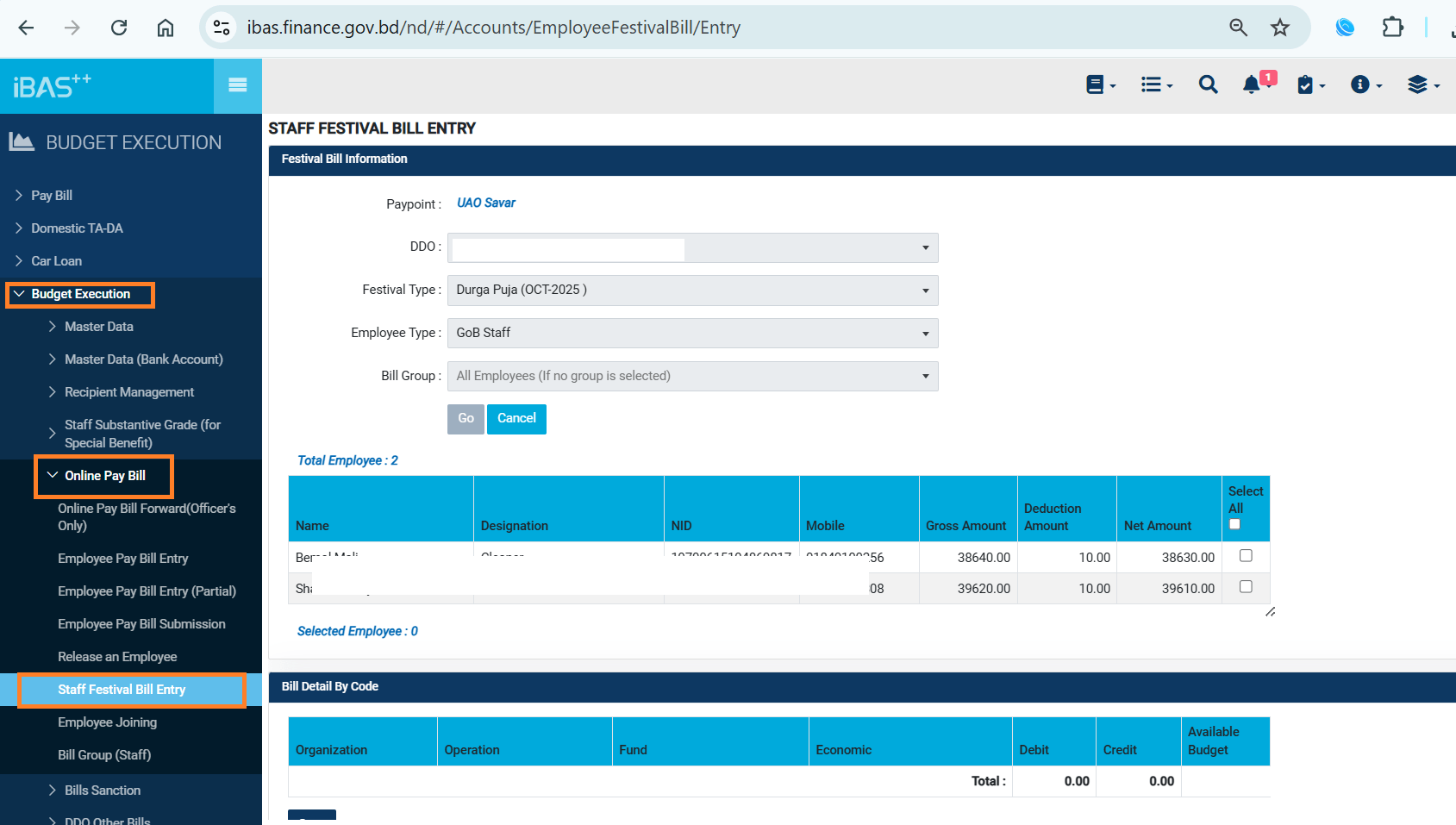 2. Click Online Pay bill>Staff Festival Bill Entry>Select Fiscal Year>Select Month of Accounting (Durga Puja -OCT-2020 )> Select DDO and Click GO