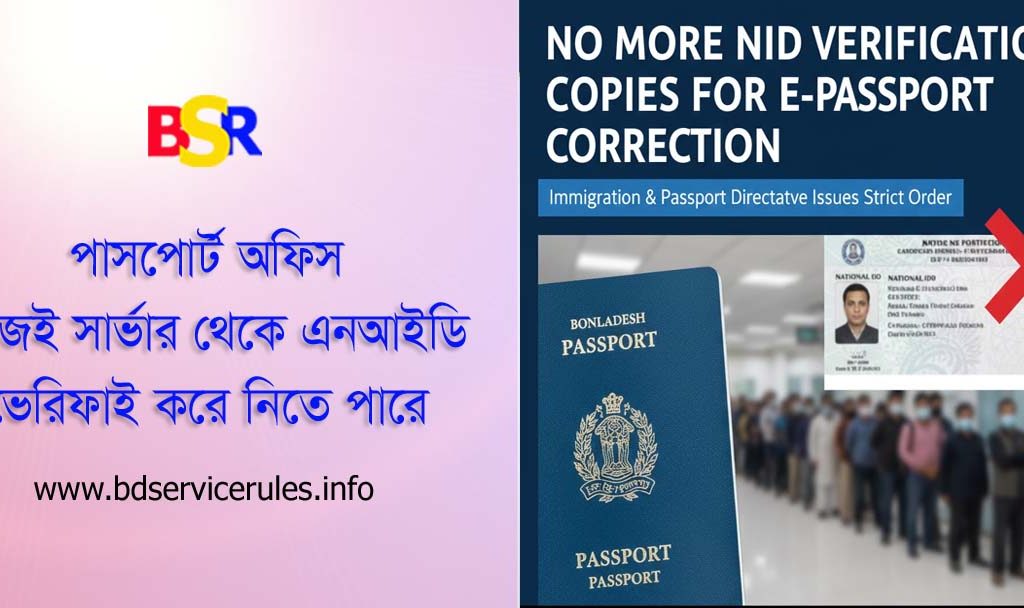 সাধারণত পাসপোর্ট সংশোধন করতে গেলে এনআইডি তথ্যের সাথে অমিল পাওয়া গেলে অনেক সময় আবেদনকারীকে নির্বাচন কমিশন অফিস থেকে ভেরিফাইড কপি আনার জন্য ফেরত পাঠানো হতো। এতে সাধারণ নাগরিকদের সময় ও অর্থ উভয়ই অপচয় হতো। যেহেতু পাসপোর্ট অধিদপ্তরের কাছে সরাসরি এনআইডি সার্ভার ব্যবহারের এক্সেস রয়েছে, তাই এই দায়িত্বটি এখন থেকে পাসপোর্ট অফিসের কর্মকর্তাদের ওপরই অর্পণ করা হয়েছে।
