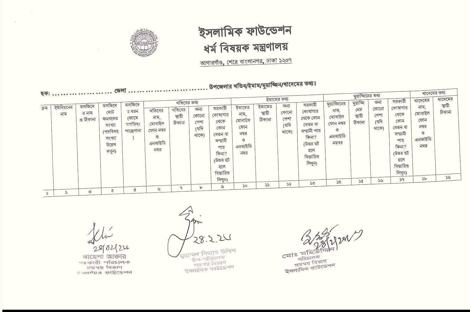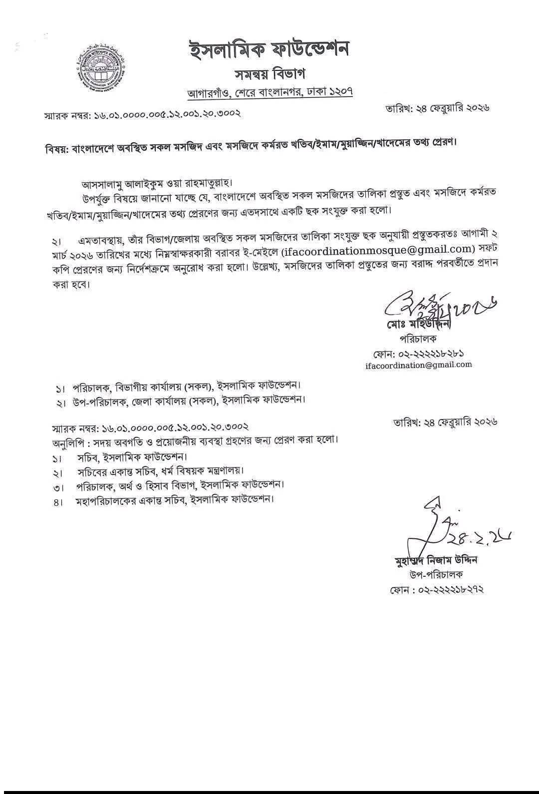 আপনার এলাকার মসজিদের খতিব, ইমাম ও মুয়াজ্জিনদের তথ্য দ্রুত সংগ্রহ করে ইসলামিক ফাউন্ডেশনের স্থানীয় কার্যালয়ে যোগাযোগ করুন অথবা নির্ধারিত ই-মেইলে নির্দিষ্ট সময়ের মধ্যে তথ্য প্রেরণ নিশ্চিত করুন।