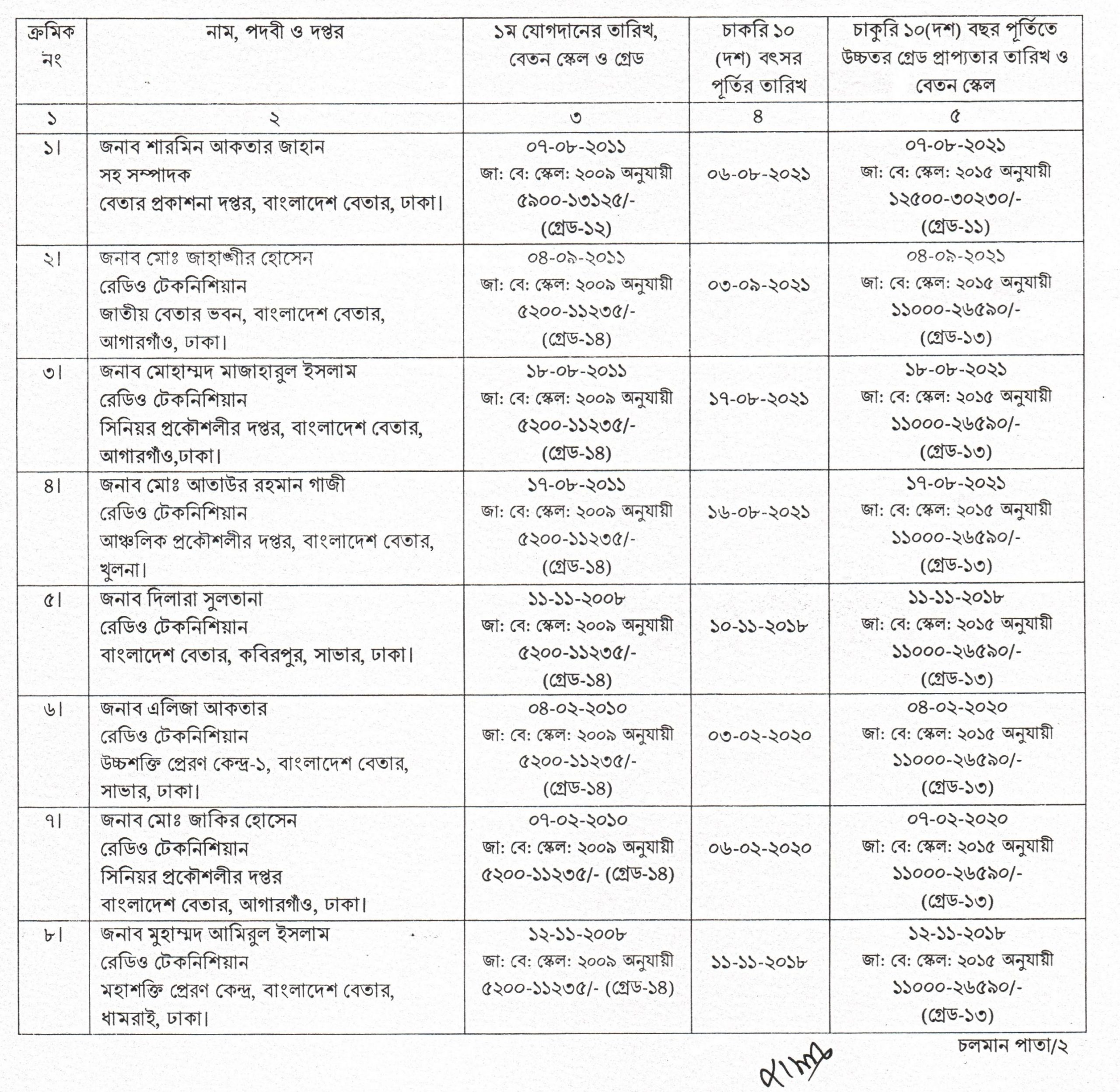 জাতীয় বেতন স্কেল ২০১৫ এর ৭ এর (১) উপ-অনুচ্ছেদ; অর্থ মন্ত্রণালয়, অর্থ বিভাগ, বাস্তবায়ন অনুবিভাগ, বাস্তবায়ন-১ শাখার ২১-০৯-২০১৬ তারিখের ০৭.০০.০০০০.১৬১.০০.০০২.১৬(অংশ-১)-২৩২ নং পরিপত্রের গ এর (৩) অনুচ্ছেদ এবং অর্থ মন্ত্রণালয়, অর্থ বিভাগ, বাস্তবায়ন অনুবিভাগ, বাস্তবায়ন-১ অধিশাখার ০৫-১১-২০২০ তারিখের ০৭.০০.০০০০.১৬১.২১.০০২.১৩. ১৫২ নং পত্রের আলােকে বাংলাদেশ বেতারের বিভিন্ন কেন্দ্র/ইউনিটে কর্মরত নিন্মােক্ত কর্মচারীদেরকে একই পদে চাকরি ১০(দশ) বছর। পূর্তিতে তাঁদের নামের পার্শ্বে বর্ণিত তারিখ হতে পরবর্তী উচ্চতর গ্রেডের মঞ্জুরী প্রদান করা হলাে :