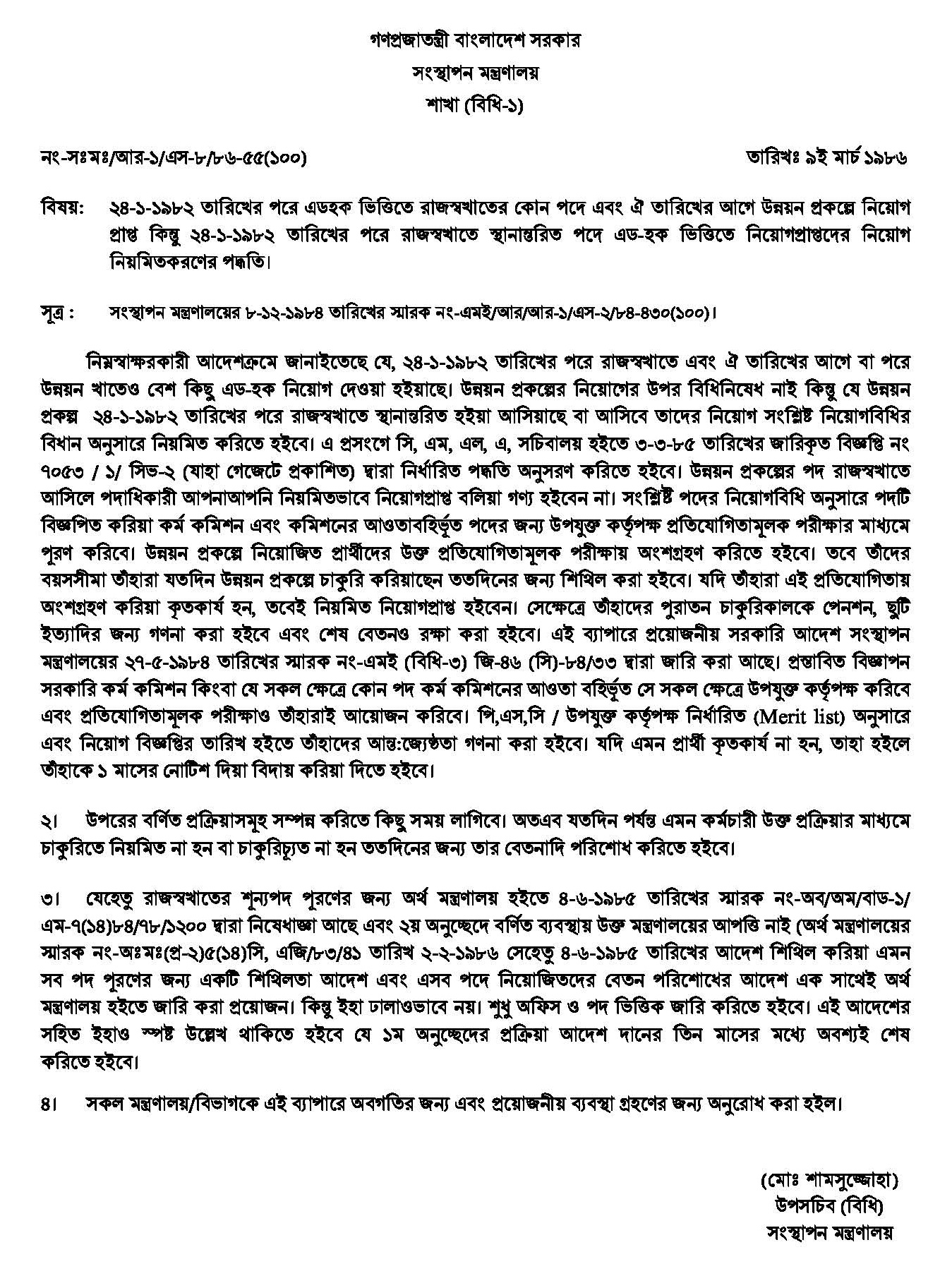 নিম্নস্বাক্ষরকারী আদেশক্রমে জানাইতেছে যে, ২৪-১-১৯৮২ তারিখের পরে রাজস্বখাতে এবং ঐ তারিখের আগে বা পরে উন্নয়ন খাতেও বেশ কিছু এড-হক নিয়োগ দেওয়া হইয়াছে। উন্নয়ন প্রকল্পের নিয়োগের উপর বিধি নিষেধ নাই কিন্তু যে উন্নয়ন প্রকল্প ২৪-১-১৯৮২ তারিখের পরে রাজস্বখাতে স্থানান্তরিত হইয়া আসিতেছে বা আসিবে তাদের নিয়োগ সংশ্লিষ্ট নিয়োগবিধির বিধান অনুসারে নিয়মিত করতে হইবে। এ প্রসঙ্গে সি,এম,এল,এ সচিবালয় হইতে ৩-৩-৮৫ তারিখের জারিকৃত বিজ্ঞপ্তি নং৭০৫৩/১/সিভ-২ (যাহা গেজেট প্রকাশিত) দ্বারা নির্ধারিত পদ্ধতি অনুসরণ করিতে হইবে। উন্নয়ন প্রকল্পের পদ রাজস্বখাতে আসিলে পদাধিকারী আপনা আপনি নিয়মিতভাবে নিয়োগপ্রাপ্ত বলিয়া গণ্য হইবেন। সংশ্লিষ্ট পদের নিয়োগ বিধি অনুসারে পদটি বিজ্ঞপিত করিয়া কর্ম কমিশন এবং কমিশনের এবং কমিশনের আওতাবর্হিভূত পদের জন্য উপযুক্ত কর্তৃপক্ষ প্রতিযোগিতামূলক পরীক্ষার মাধ্যমে পূরণ করিবে। উন্নয়ন প্রকল্পে নিয়োজিত প্রার্থীদের উক্ত প্রতিযোগিতামূলক পরীক্ষায় অংশগ্রহণ করিতে হইবে। তবে তাঁদের বয়স সীমা তাঁহারা যতদিন উন্নয়ন প্রকল্পে চাকুরি করিয়াছেন ততদিনের জন্য শিথিল করা হইবে।