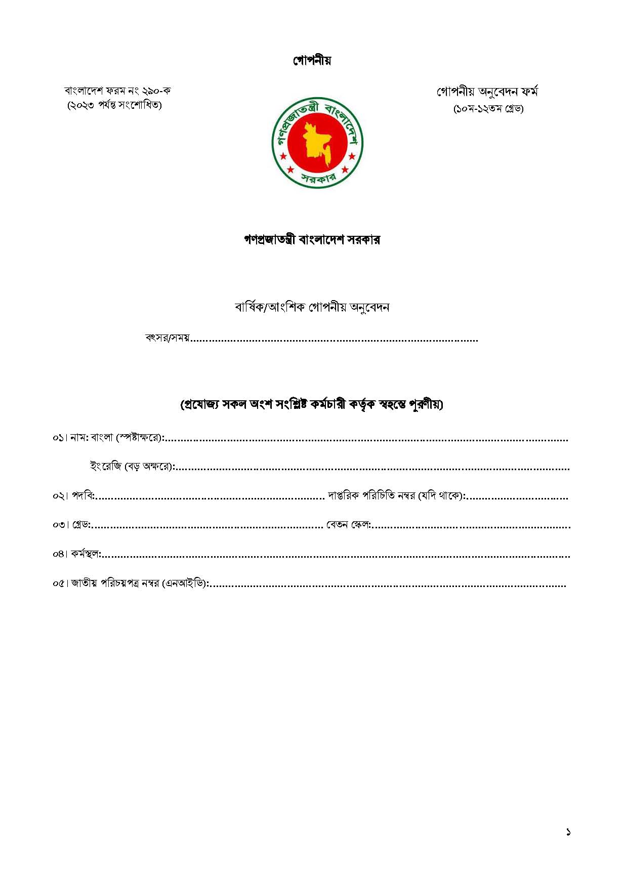 এটি মূলত ১০ম থেকে ১২তম গ্রেডের (যা সাধারণত ২য় শ্রেণীর মর্যাদাভুক্ত) সরকারি কর্মচারীদের বার্ষিক বা আংশিক গোপনীয় অনুবেদন (এসিআর) ফরম। এই ফরমটি পূরণের পদ্ধতি নিচে বিস্তারিতভাবে দেওয়া হলো: