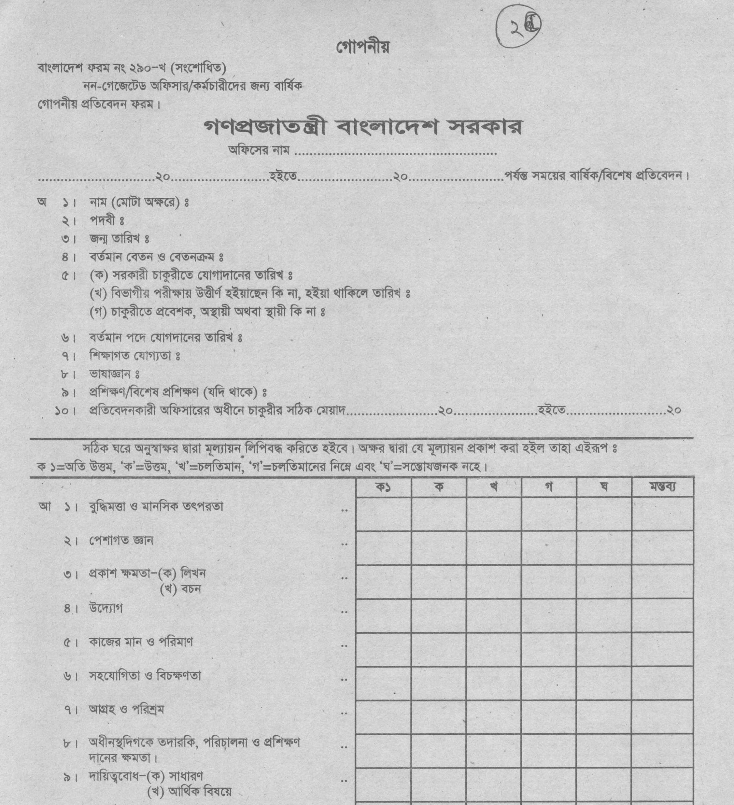 সরকারি কর্মচারীদের ১৬তম গ্রেড হতে ১০ম গ্রেড ভুক্ত তথা পূর্বতন দ্বিতীয় ও তৃতীয় শ্রেণির কর্মকর্তা/কর্মচারীদের জন্য গোপনীয় অনুবেদন ফর্ম সুনির্দিষ্টকরণ- গোপনীয় অনুবেদন ফর্ম ২০২৩