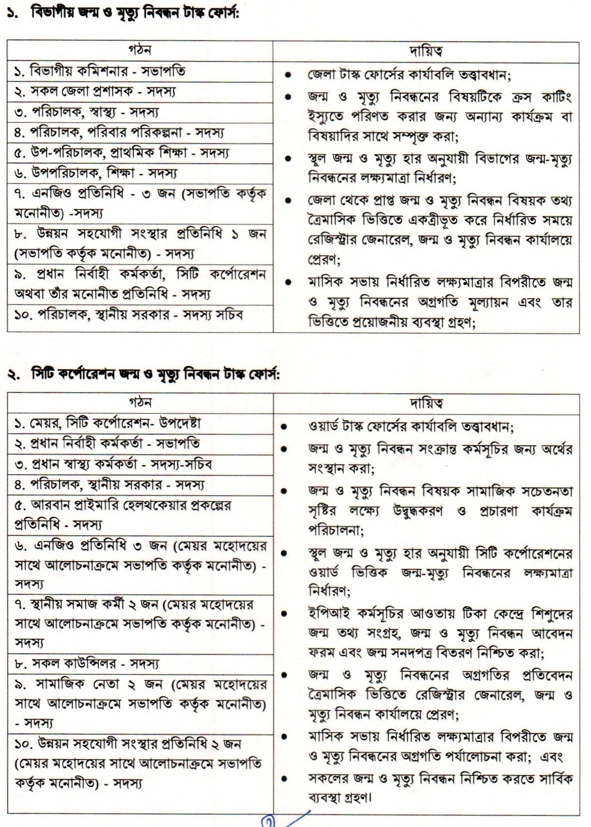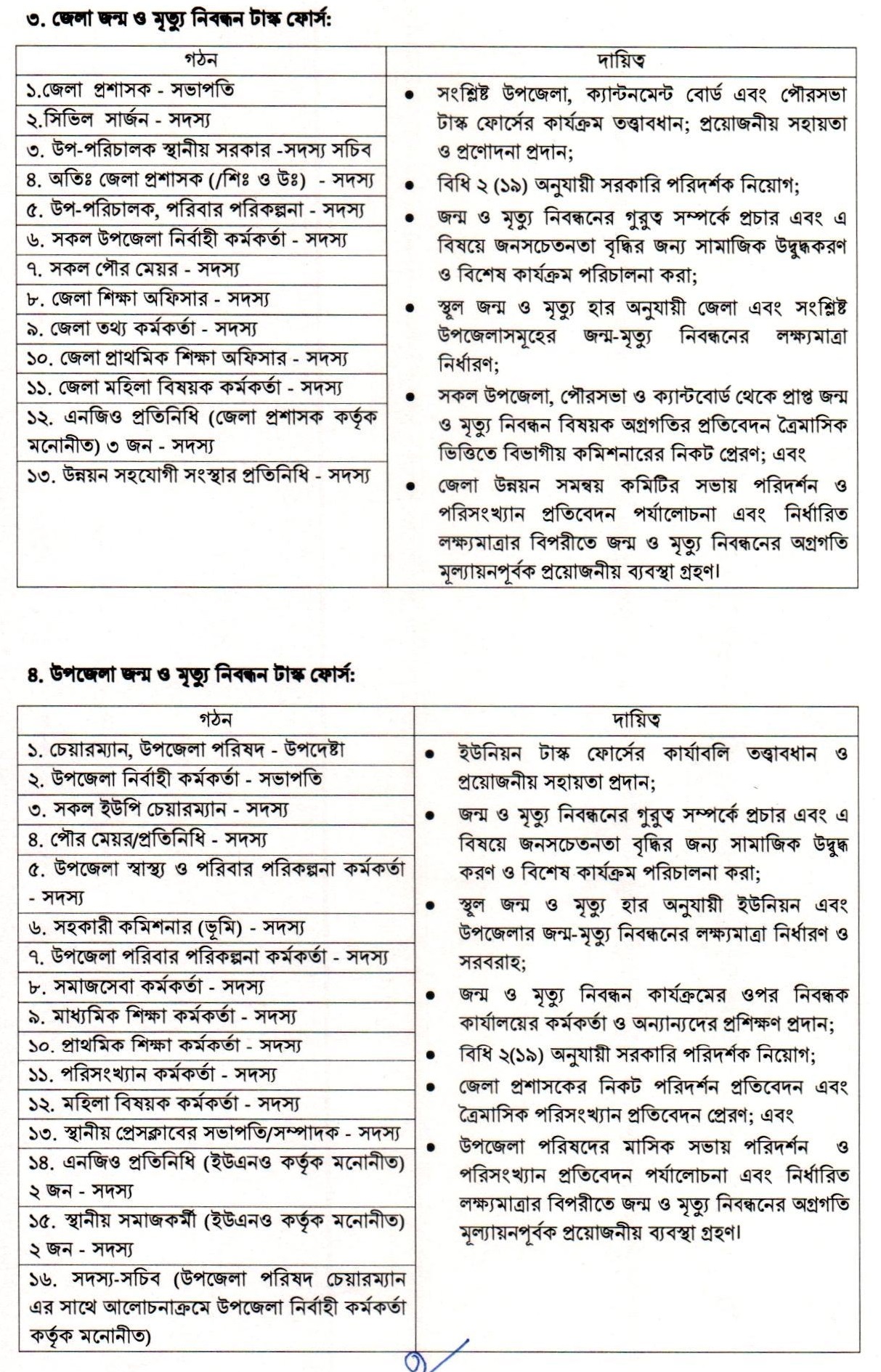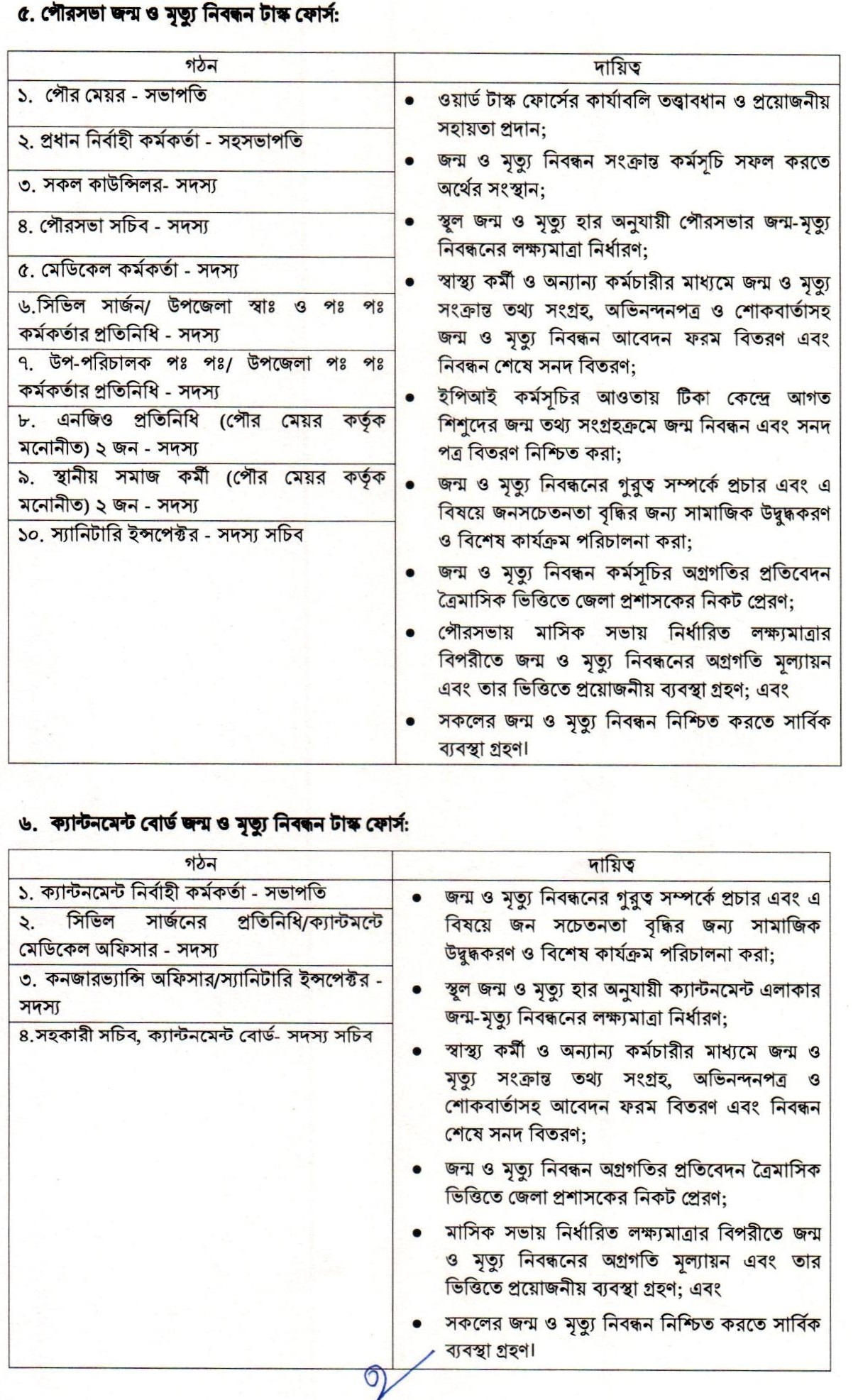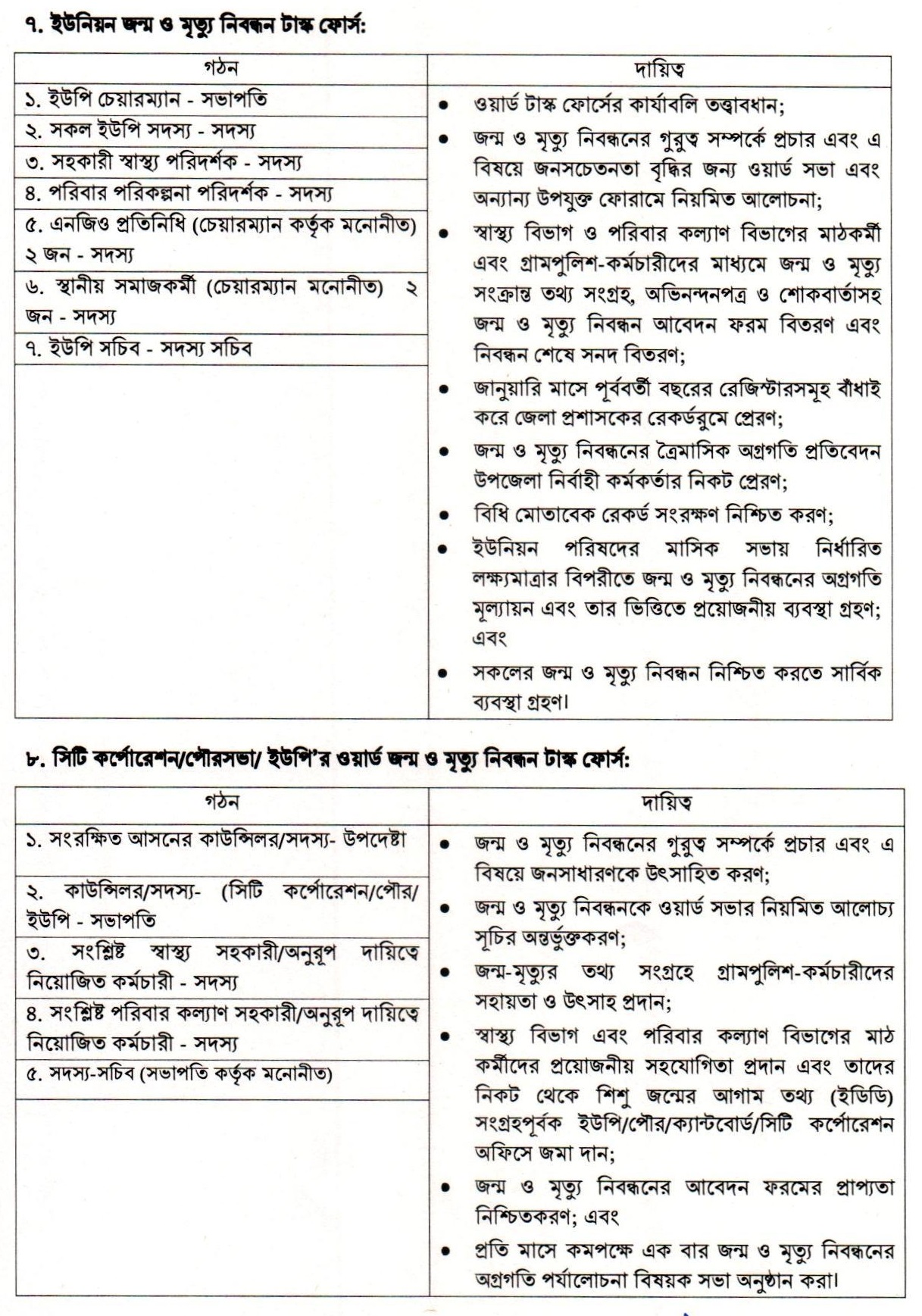 ০৭ নির্ধারিত সময়ে জন্ম ও মৃত্যু নিবন্ধন নিশ্চিতকরণ, নিবন্ধন কার্যক্রম পরিদর্শন, তত্ত্ববধান ও পরিবীক্ষণ এবং প্রয়ােজনীয় সহায়তা প্রদানের উদ্দেশ্যে নিম্মােক্তভাবে বিভিন্ন পর্যায়ে টাস্ক ফোর্সসমূহ গঠন করা হল: