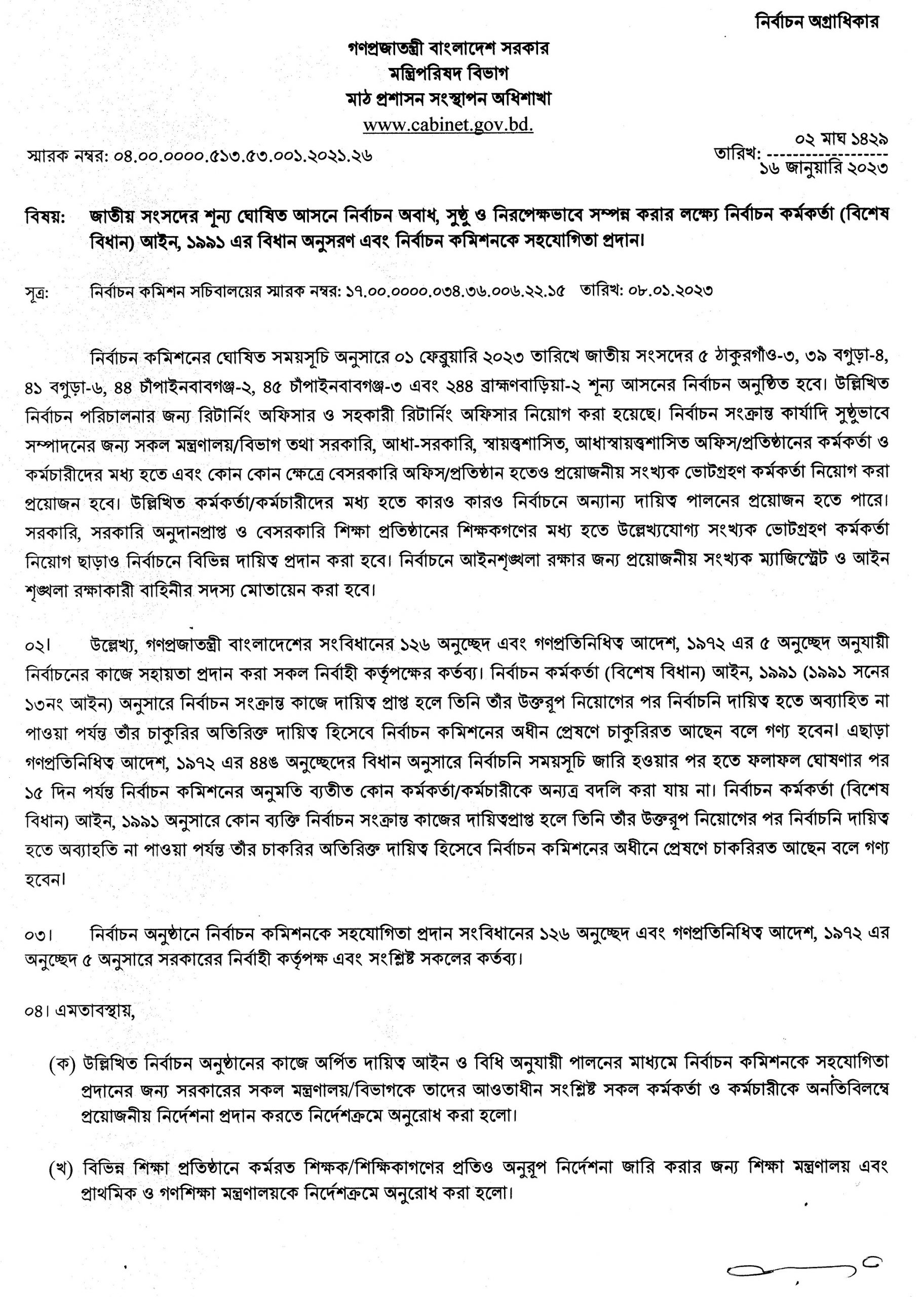 জাতীয় সংসদের শুন্য আসনে সুষ্ঠু নির্বাচন ২০২৩ । নির্বাচন কমিশনকে সহযোগিতা প্রদানের নির্দেশনা