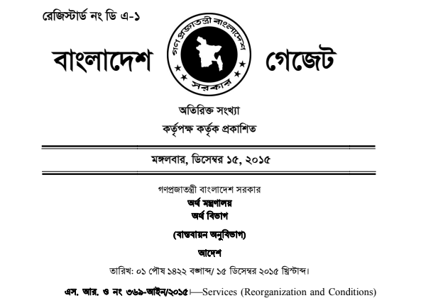 এস.আর.ও নং ৩৬৯-আইন/২০১৫।Services (Reorganization and Conditions) Act. 1975 (Act No XXXII of 1975) এর Section 5 এ প্রদত্ত ক্ষমতাবলে সরকার নিম্নরূপ আদেশ জারি করিল, যথা: