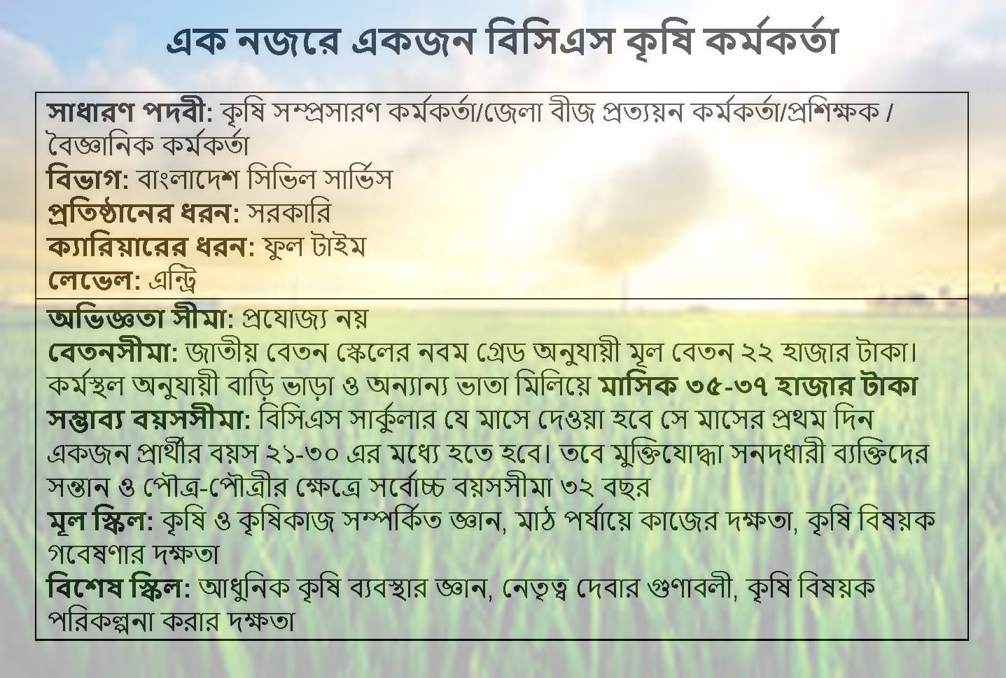 জেলা অফিসে কাজ করেন। কর্মজীবনের শুরুতে একজন কৃষি সম্প্রসারণ কর্মকর্তা উপজেলা কৃষি সম্প্রসারণ অফিসে কাজ করেন। জেলা বীজ প্রত্যয়ন কর্মকর্তা জেলা বীজ প্রত্যয়ন অফিসে এবং একজন প্রশিক্ষক কৃষি প্রশিক্ষণ ইন্সটিটিউটে কাজ করেন। এ সকল দপ্তর কৃষি সম্প্রসারণ অধিদপ্তরের অধিনস্ত। এছাড়া বৈজ্ঞানিক কর্মকর্তাগণ মৃত্তিকা উন্নয়ন গবেষণা ইন্সটিটিউটে কাজ করেন। এটি কৃষি মন্ত্রণালয়ের নিয়ন্ত্রণাধীন একটি প্রতিষ্ঠান।