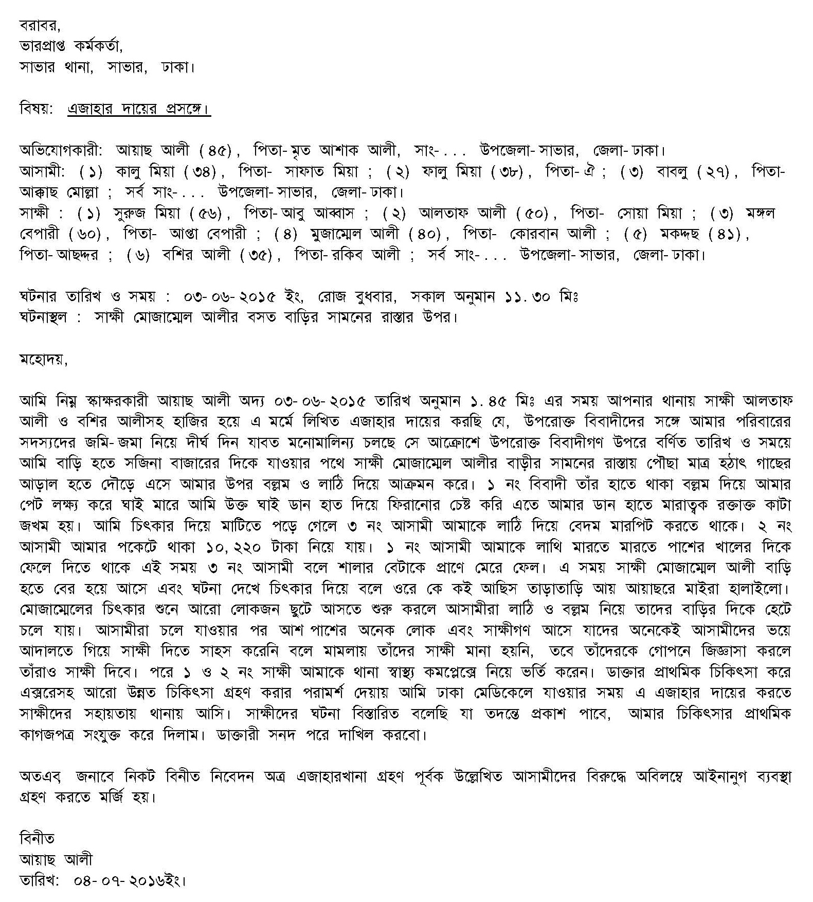 এজাহার নমুনা । থানায় মামলা করার নমুনা কপি pdf