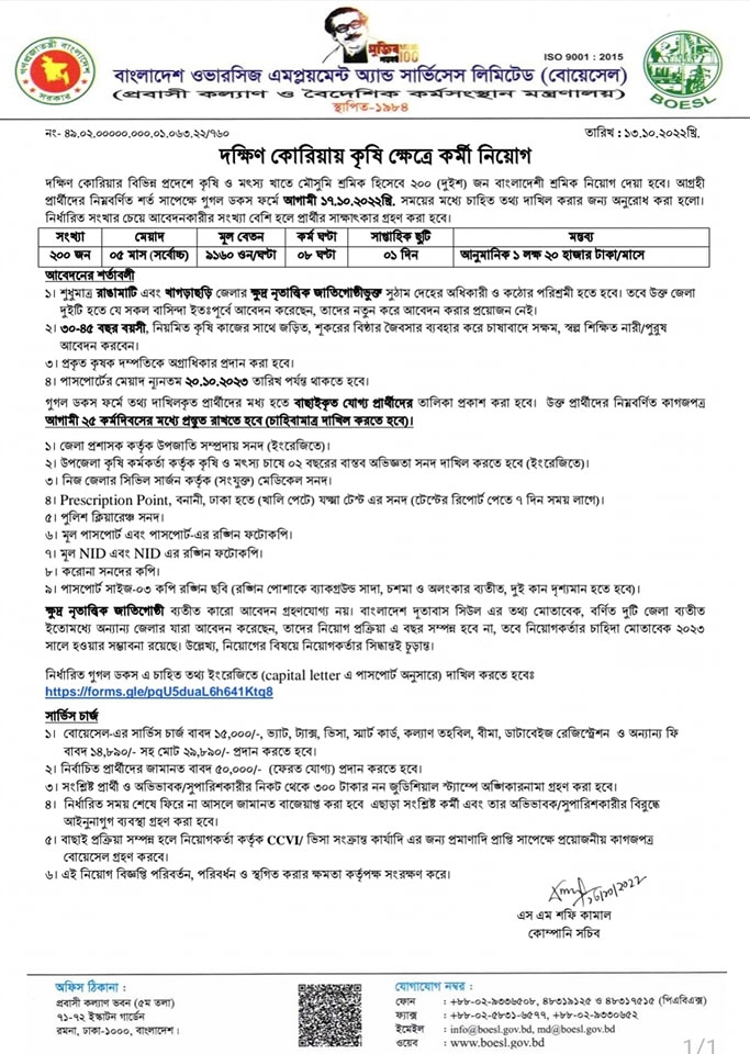 দক্ষিণ কোরিয়ায় কৃষি ক্ষেত্রে কর্মী নিয়ােগ। দক্ষিণ কোরিয়ার বিভিন্ন প্রদেশে কৃষি ও মৎস্য খাতে মৌসুমি শ্রমিক হিসেবে ২০০ (দুইশ) জন বাংলাদেশী শ্রমিক নিয়ােগ দেয়া হবে। আগ্রহী। প্রার্থীদের নিম্নবর্ণিত শর্ত সাপেক্ষে গুগল ডকস ফর্মে আগামী ১৭-১০-২০২২খ্রি. সময়ের মধ্যে চাহিত তথ্য দাখিল করার জন্য অনুরােধ করা হয়েছে।