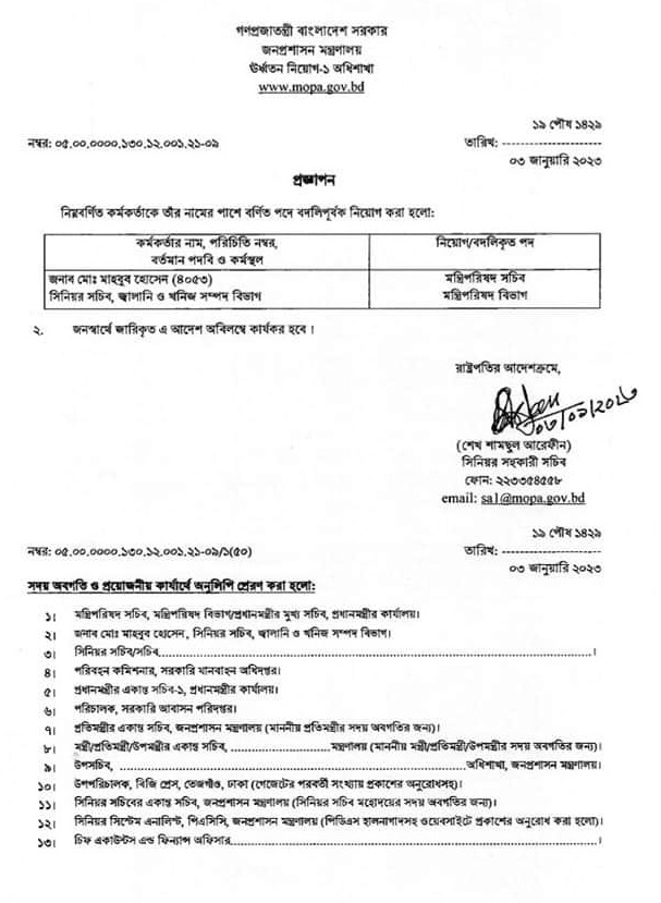 মন্ত্রি পরিষদ সচিব নিয়োগ করে প্রজ্ঞাপন জারি / জনাব মো: মাহবুব হোসেন বর্তমানে নতুন মন্ত্রিপরিষদ সচিব