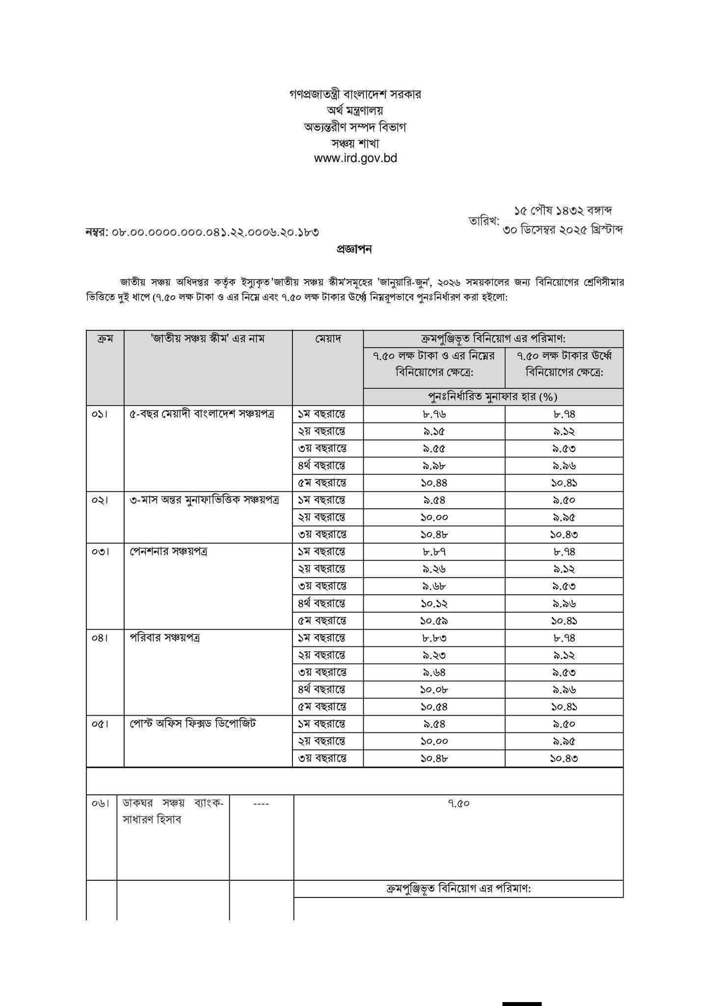জাতীয় সঞ্চয় স্কিমসমূহের মুনাফার হার জানুয়ারি-জুন, ২০২৬ সময়ের জন্য পুনঃনির্ধারণ।