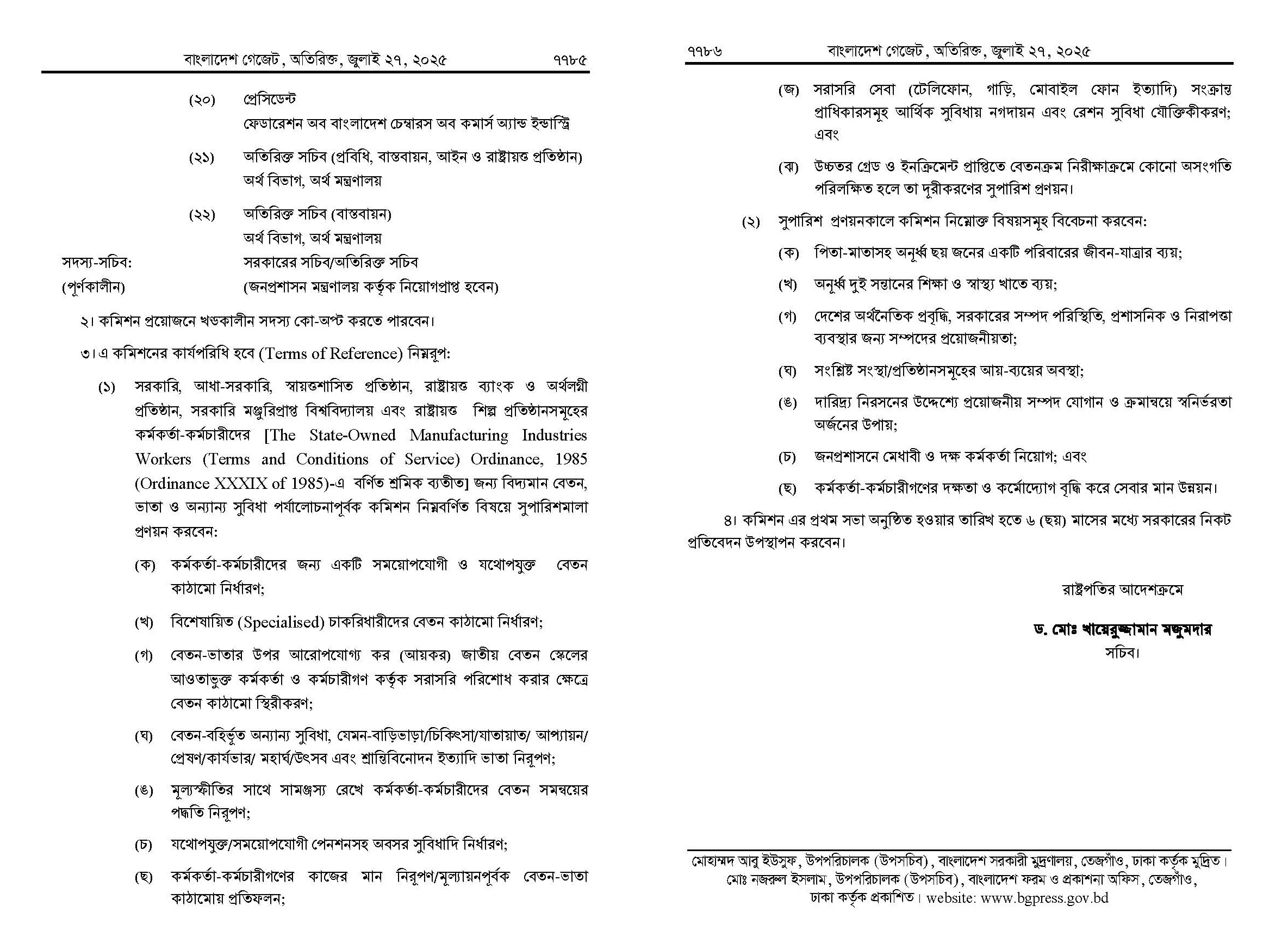 - প্রতিবেদন জমা: কমিশনকে ৬ মাসের মধ্যে সরকারের কাছে নতুন পে স্কেলের সুপারিশ সম্বলিত প্রতিবেদন জমা দিতে বলা হয়েছে (কমিশন জুলাই মাসে গঠিত হওয়ায় ডিসেম্বর ২০২৫/জানুয়ারি ২০২৬-এর মধ্যে প্রতিবেদন জমার সম্ভাবনা রয়েছে)।