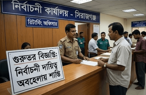 গতকাল (২০ এপ্রিল, ২০২৬) সিরাজগঞ্জ জেলা ম্যাজিস্ট্রেট ও রিটার্নিং অফিসার মো. আমিনুল ইসলাম স্বাক্ষরিত এক অফিস আদেশের মাধ্যমে এই শাস্তিমূলক ব্যবস্থা গ্রহণ করা হয়।
