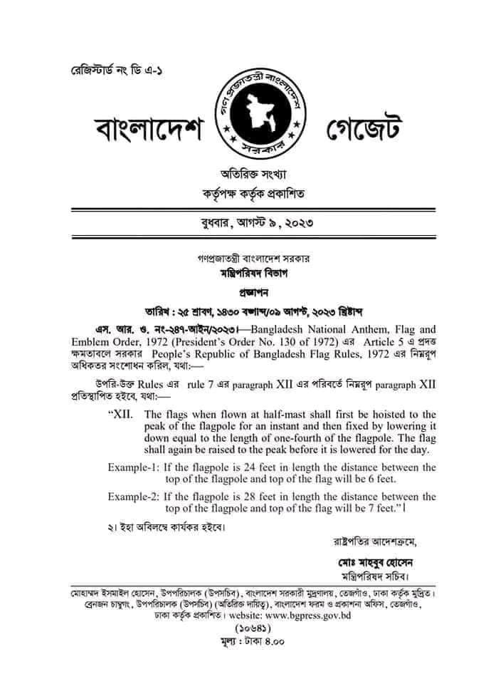 পতাকা বিধিমালা-১৯৭২ এর অধিকতর সংশোধন । পতাকাদন্ডের এক-চতুর্থাংশের সমান দৈর্ঘ্য বরাবর নিচে নামাতে হবে
