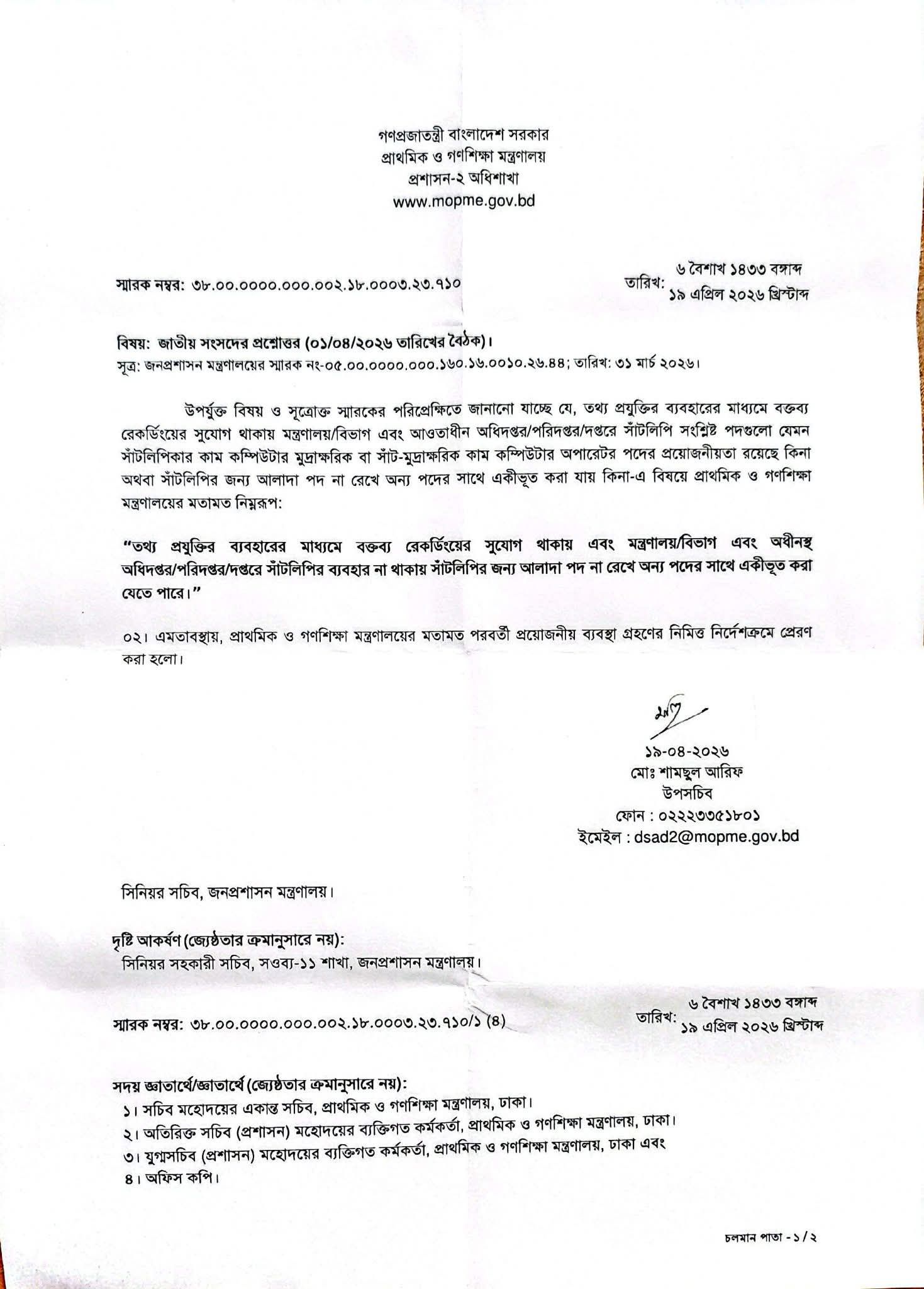 মন্ত্রণালয়ের প্রশাসন-২ অধিশাখা থেকে ১৯ এপ্রিল ২০২৬ তারিখে (০৬ বৈশাখ ১৪৩৩ বঙ্গাব্দ) এই মতামত প্রদান করা হয়। যার স্মারক নম্বর: ৩৮.০০.০০০০.০০০.০২.১৮.০০০৩.২৩.৭১০। উপ-সচিব মো: শামছুল আরিফ স্বাক্ষরিত এই মতামতটি জনপ্রশাসন মন্ত্রণালয়ের সিনিয়র সচিবের নিকট প্রয়োজনীয় ব্যবস্থা গ্রহণের জন্য পাঠানো হয়েছে।