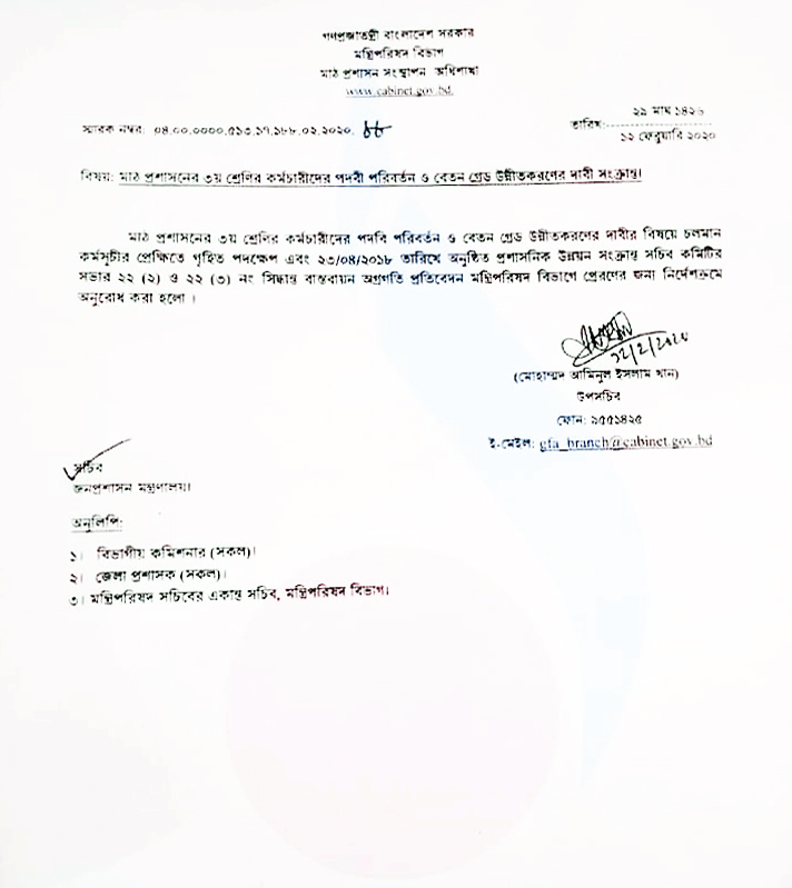 বিষয়: মাঠ প্রশাসনের ৩য় শ্রেণীর কর্মচারীদের পদবী পরিবর্তন ও বেতন গ্রেড উন্নীতকরণের দাবী সংক্রান্ত।