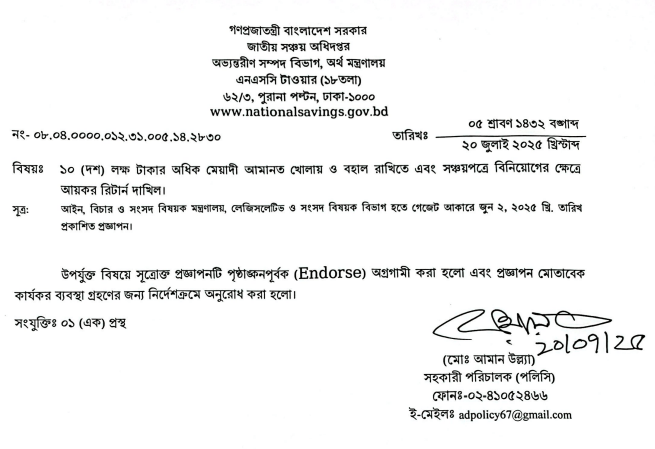 ১০ লাখ টাকার বেশি সঞ্চয়পত্র ক্রয়ে রিটার্ন দাখিলের প্রমাণপত্র বাধ্যতামূলক: ডাউনলোড