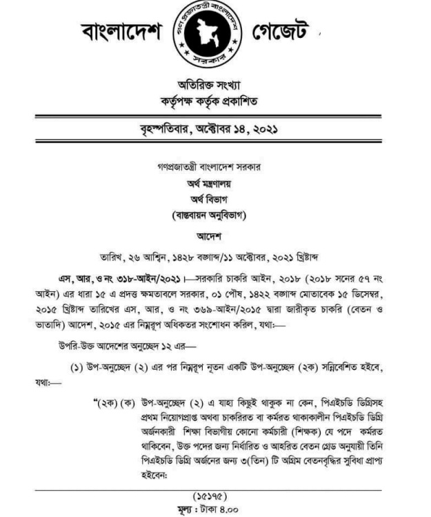 “(২ক) (ক) উপ-অনুচ্ছেদ (২) এ যাহা কিছুই থাকুক না কেন, পিএইচডি ডিগ্রিসহ প্রথম নিয়ােগপ্রাপ্ত অথবা চাকরিরত বা কর্মরত থাকাকালীন পিএইচডি ডিগ্রি অর্জনকারী শিক্ষা বিভাগীয় কোনাে কর্মচারী (শিক্ষক) যে পদে কর্মরত থাকিবেন, উক্ত পদের জন্য নির্ধারিত ও আহরিত বেতন গ্রেড অনুযায়ী তিনি পিএইচডি ডিগ্রি অর্জনের জন্য ৩(তিন) টি অগ্রিম বেতনবৃদ্ধির সুবিধা প্রাপ্য হইবেন:-