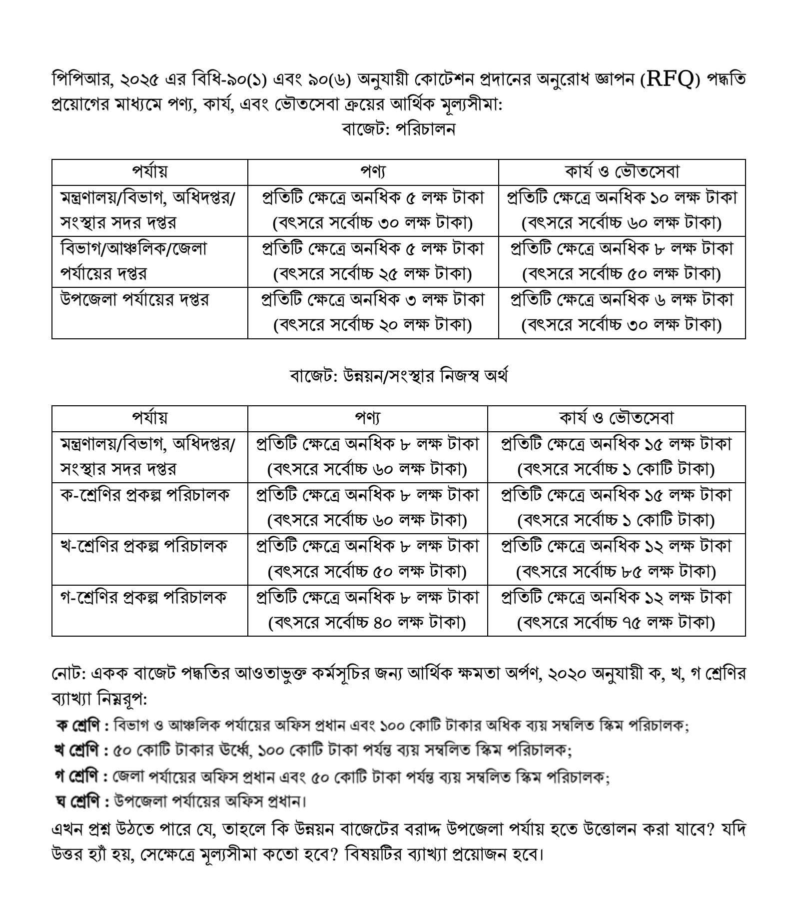 সহজ কথায়, সাধারণ অফিস কেনাকাটা বা ছোটখাটো সংস্কার কাজের জন্য একজন উপজেলা কর্মকর্তা পণ্য হলে ৩ লক্ষ এবং কাজ হলে ৬ লক্ষ টাকার বেশি আরএফকিউ করতে পারবেন না।