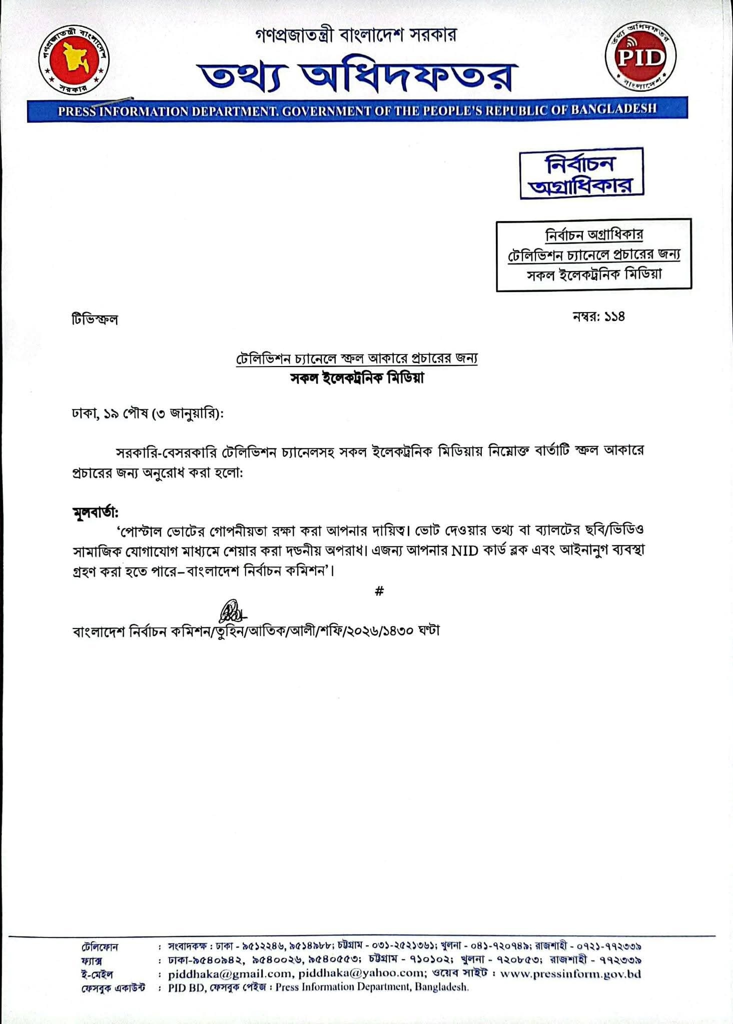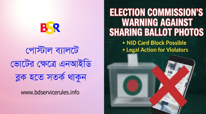 মূল বার্তা: “পোস্টাল ভোটের গোপনীয়তা রক্ষা করা আপনার দায়িত্ব। ভোট দেওয়ার তথ্য বা ব্যালটের ছবি/ভিডিও সামাজিক যোগাযোগ মাধ্যমে শেয়ার করা দণ্ডনীয় অপরাধ। এজন্য আপনার NID কার্ড ব্লক এবং আইনানুগ ব্যবস্থা গ্রহণ করা হতে পারে— বাংলাদেশ নির্বাচন কমিশন।”