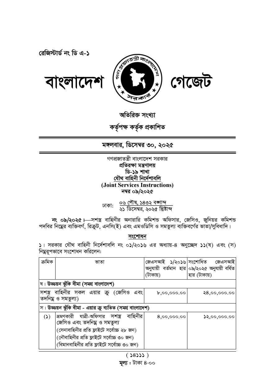 ১. এয়ার ক্রু (Air Crew) ঝুঁকি বীমা: সশস্ত্র বাহিনীর সকল এয়ার ক্রু (জেসিও এবং তদনিম্ন ও সমতুল্য পদবি) -এর ক্ষেত্রে উড্ডয়ন ঝুঁকি বীমার পরিমাণ ৮,০০,০০০ টাকা থেকে বাড়িয়ে ২৪,০০,০০০ টাকা করা হয়েছে ।