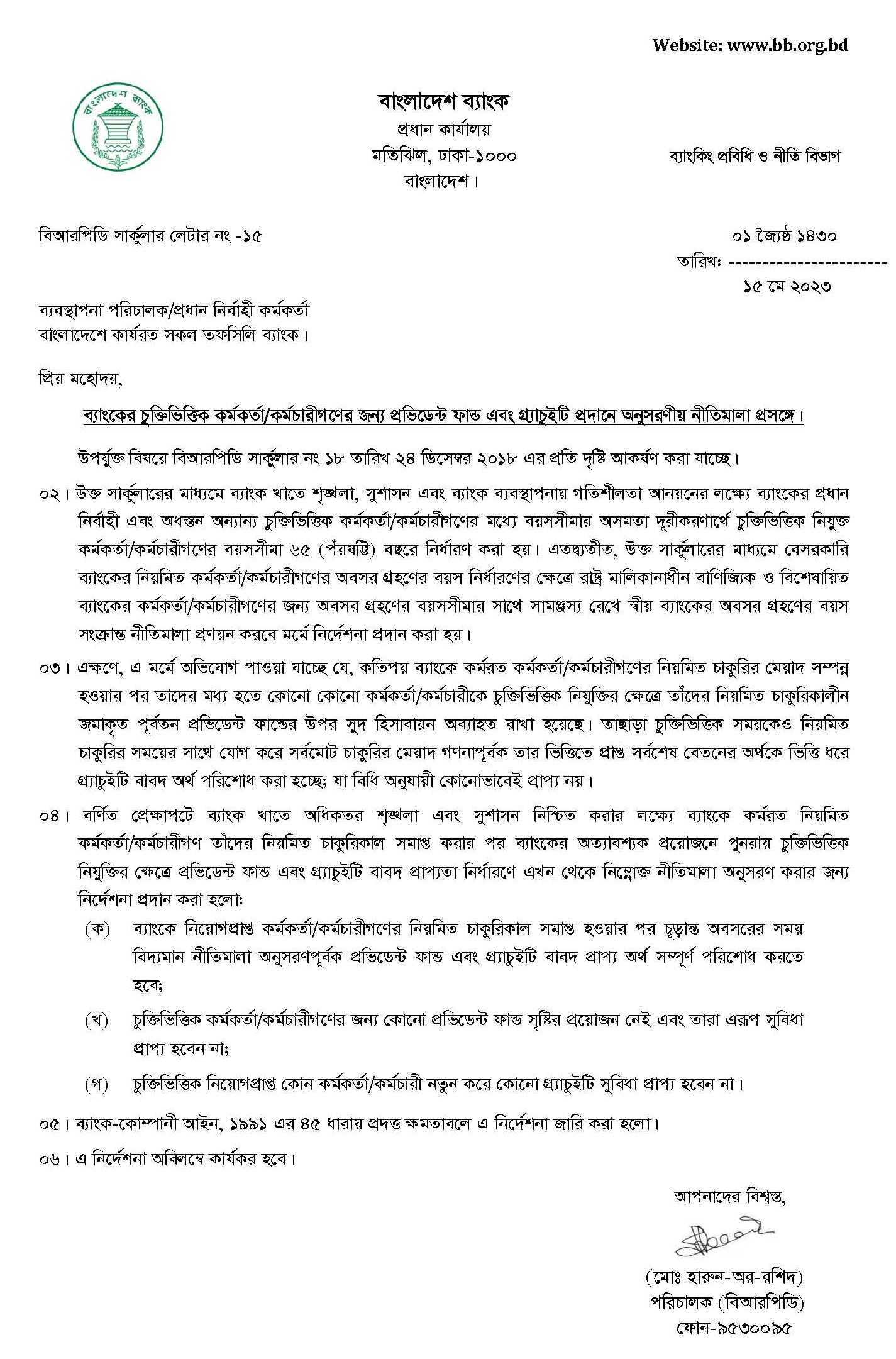 ব্যাংক খাতে অধিকতর শৃঙ্খলা এবং সুশাসন নিশ্চিত করার লক্ষ্যে ব্যাংকে কর্মরত নিয়মিত কর্মকর্তা/কর্মচারীগণ তাঁদের নিয়মিত চাকুরিকাল সমাপ্ত করার পর ব্যাংকের অত্যাবশ্যক প্রয়োজনে পুনরায় চুক্তিভিত্তিক নিযুক্তির ক্ষেত্রে প্রভিডেন্ট ফান্ড এবং গ্র্যাচুইটি বাবদ প্রাপ্যতা নির্ধারণে এখন থেকে নিম্নোক্ত নীতিমালা অনুসরণ করার জন্য নির্দেশনা প্রদান করা হয়েছে।