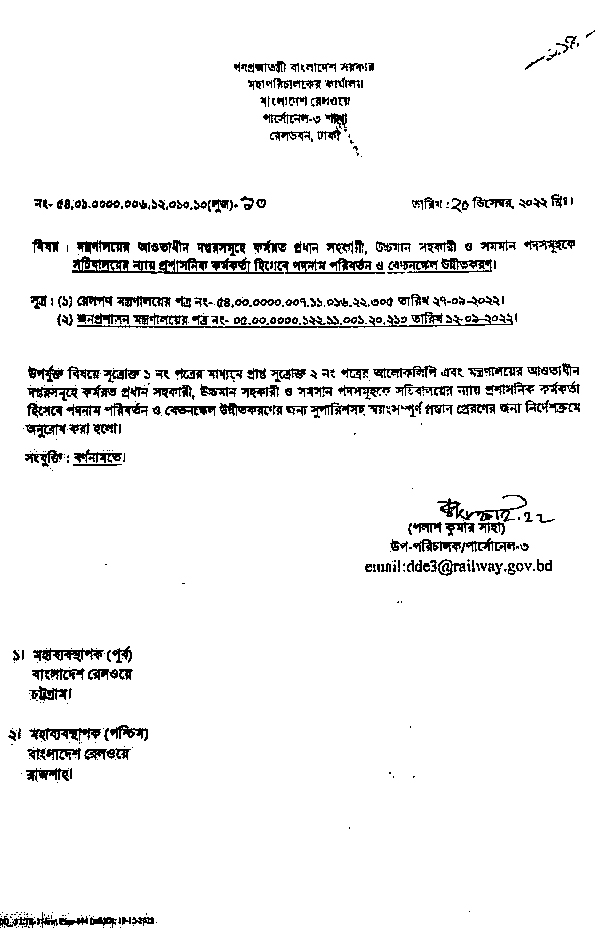বাংলাদেশ রেলওয়ে ছাড়াও সকল দপ্তর, সংযুক্ত অধিদপ্তর, পরিদপ্তর এবং দপ্তরের বিদ্যমান প্রধান সহকারী, উচ্চমান সহকারী ও সমমান পদসমূহের পদ-পদবি পরিবর্তনের বিষয়ে স্ব-স্ব দপ্তর/সংস্থার মাধ্যমে যৌক্তিকতাসহ সংশ্লিষ্ট প্রশাসনিক মন্ত্রণালয়/বিভাগে আবেদন করলে প্রশাসনিক মন্ত্রণালয়/বিভাগ পরীক্ষা-নিরীক্ষাপূর্বক সুপারিশসহ স্বয়ংসম্পূর্ণ প্রস্তাব জনপ্রশাসন মন্ত্রণালয়ে প্রেরণ করতে পারে।’ এমন চিঠি গত সেপ্টেম্বর/২০২২ মাসেই ইস্যু করা হয়েছে। জেলা প্রশাসকের কার্যালয়ের কর্মচারীদের পদনাম পরিবর্তন ২০২২