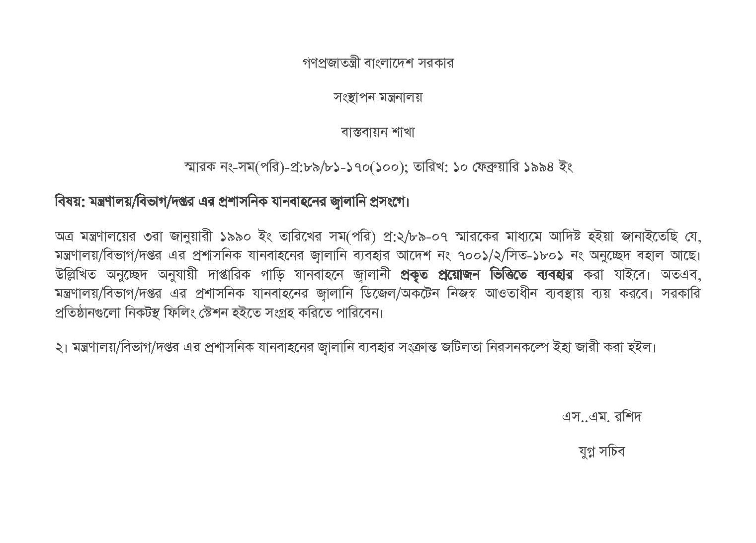 অত্র মন্ত্রণালয়ের ৩রা জানুয়ারী ১৯৯০ ইং তারিখের সম(পরি) প্র:২/৮৯-০৭ স্মারকের মাধ্যমে আদিষ্ট হইয়া জানাইতেছি যে, মন্ত্রণালয়/বিভাগ/দপ্তর এর প্রশাসনিক যানবাহনের জ্বালানি ব্যবহার আদেশ নং ৭০০১/২/সিত-১৮০১ নং অনুচ্ছেদ বহাল আছে। উল্লিখিত অনুচ্ছেদ অনুযায়ী দাপ্তারিক গাড়ি যানবাহনে জ্বালানী প্রকৃত প্রয়োজন ভিত্তিতে ব্যবহার করা যাইবে। অতএব, মন্ত্রণালয়/বিভাগ/দপ্তর এর প্রশাসনিক যানবাহনের জ্বালানি ডিজেল/অকটেন নিজস্ব আওতাধীন ব্যবস্থায় ব্যয় করবে। সরকারি প্রতিষ্ঠানগুলো নিকটস্থ ফিলিং স্টেশন হইতে সংগ্রহ করিতে পারিবেন।