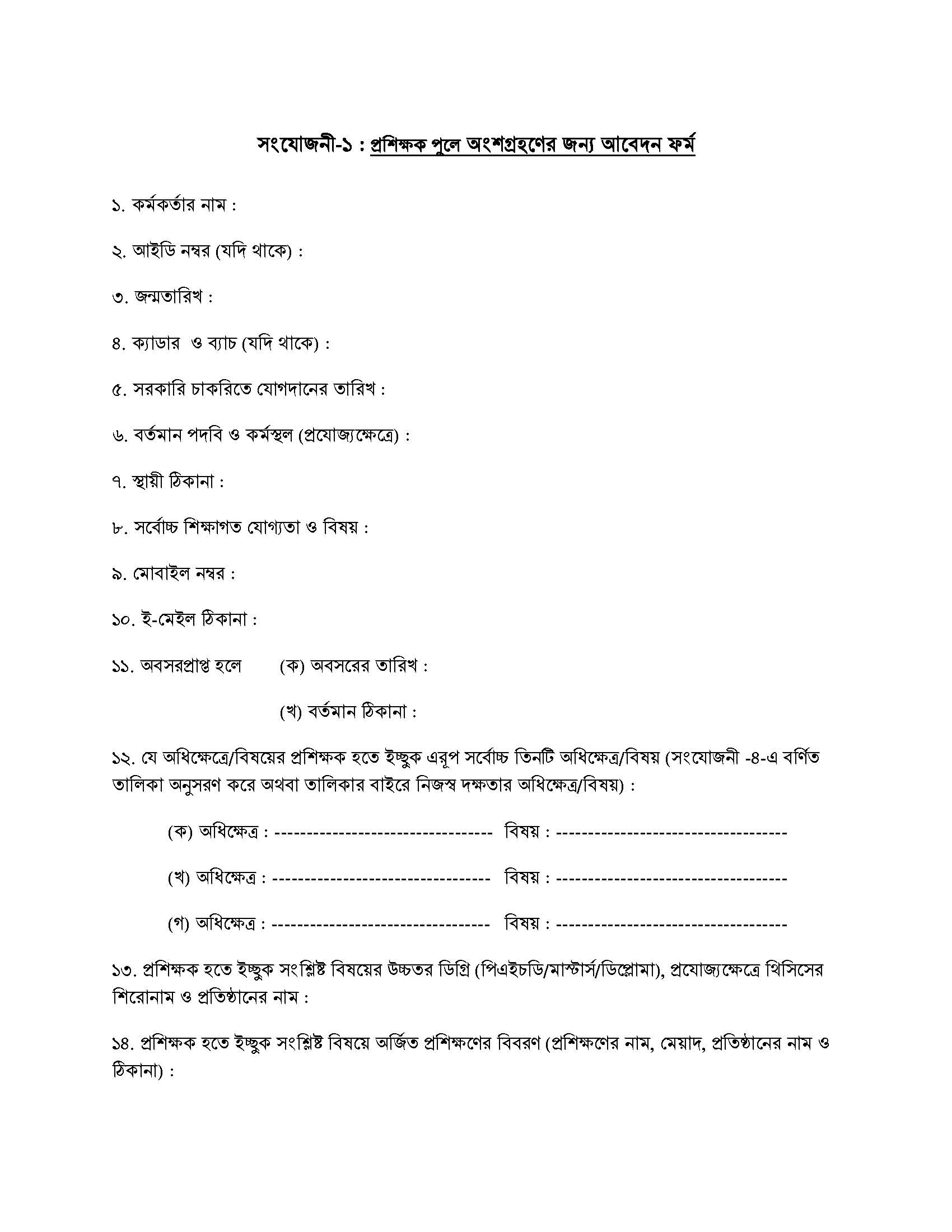 - প্রশিক্ষণ প্রতিষ্ঠানের অনুষদ সদস্যগণ যাঁরা ন্যূনতম তিন বছর প্রশিক্ষণ প্রদানের সঙ্গে সম্পৃক্ত তাঁরাও প্রশিক্ষক পুলে অন্তর্ভুক্তির জন্য আবেদন করতে পারবেন।