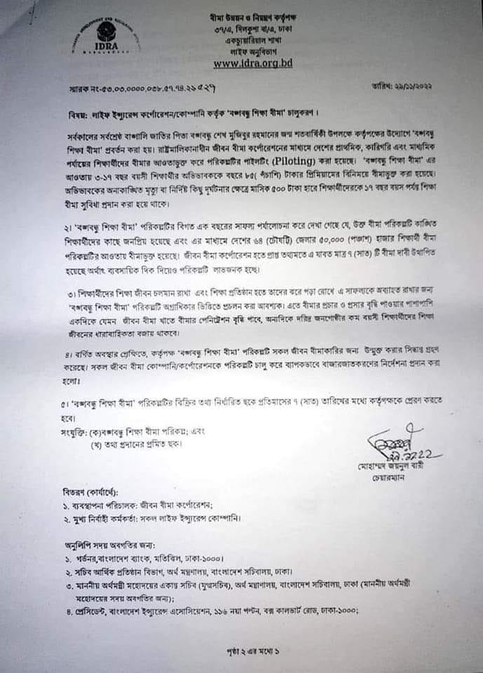 বঙ্গবন্ধু শিক্ষা বীমা পাইলটিং শেষে সারা দেশে চালুর পরিকল্পনা নিয়েছে বীমা উন্নয়ন ও নিয়ন্ত্রণ কর্তৃপক্ষ – আপনার সন্তানের শিক্ষা সুনিশ্চিত করতে এ বীমাটি করুন– বঙ্গবন্ধু শিক্ষা বীমা ২০২২