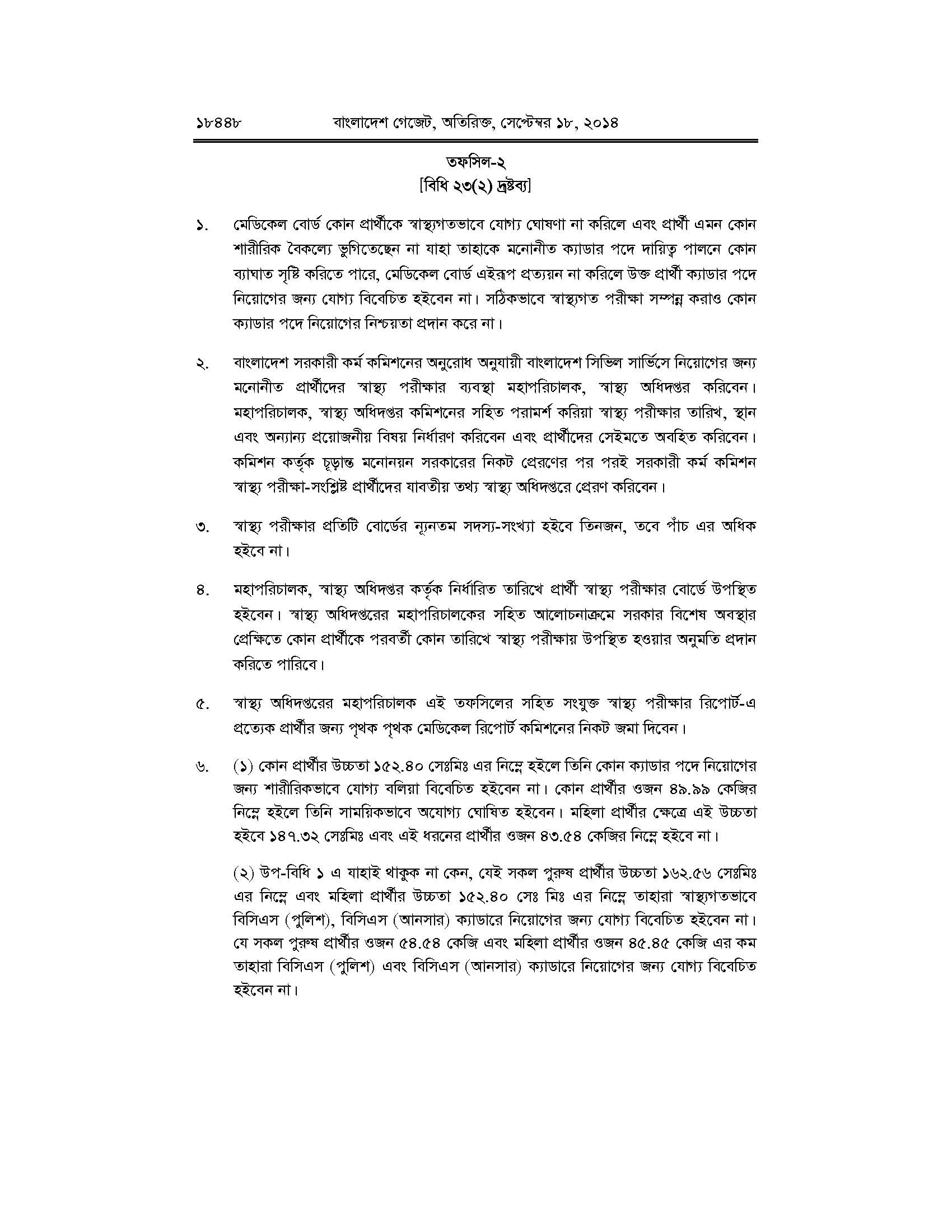 ২৩। স্বাস্থ্য পরীক্ষা।—(১) লিখিত ও মৌখিক পরীক্ষায় উত্তীর্ণ প্রার্থীদের মধ্য হইতে কমিশন কর্তৃক চূড়ান্ত সুপারিশের ফলাফল প্রকাশের পর মনােনীত প্রার্থীগণকে স্বাস্থ্য পরীক্ষার জন্য মেডিকেল বাের্ডের সম্মুখে উপস্থিত হইতে হইবে।