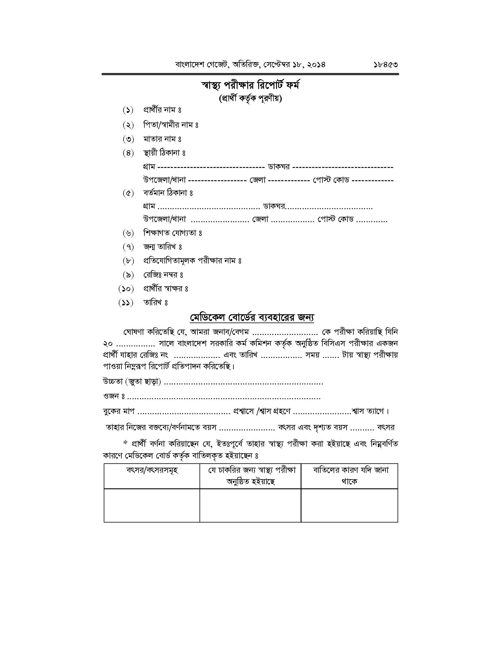 (২) স্বাস্থ্য পরীক্ষার ধরন এবং পদ্ধতি তফসিল-২ অনুযায়ী পরিচালিত হইবে।