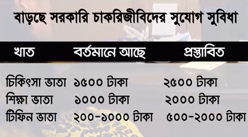 সরকারি কর্মচারীদের চিকিৎসা ভাতা গ্রেড অনুযায়ী ১৫০০ টাকা হতে বৃদ্ধি পেয়ে ২৫০০ টাকা পর্যন্ত হতে পারে। শিক্ষা ভাতা এক সন্তানদের জন্য ৫০০ টাকা এবং দু’সন্তানের জন্য ১০০০ টাকা বৃদ্ধি পেয়ে সর্বোচ্চ ২০০০ টাকা পর্যন্ত বৃদ্ধি পেতে পারে। টিফিন ভাতা গ্রেড অনুসারে ২০০ টাকা হতে বৃদ্ধি পেয়ে ২০০০ টাকা পর্যন্ত বৃদ্ধি করা হতে পারে। ভাতা বৃদ্ধির ক্ষেত্রে দ্বিগুণ নীতি অনুসরণ করা হতে পারে।