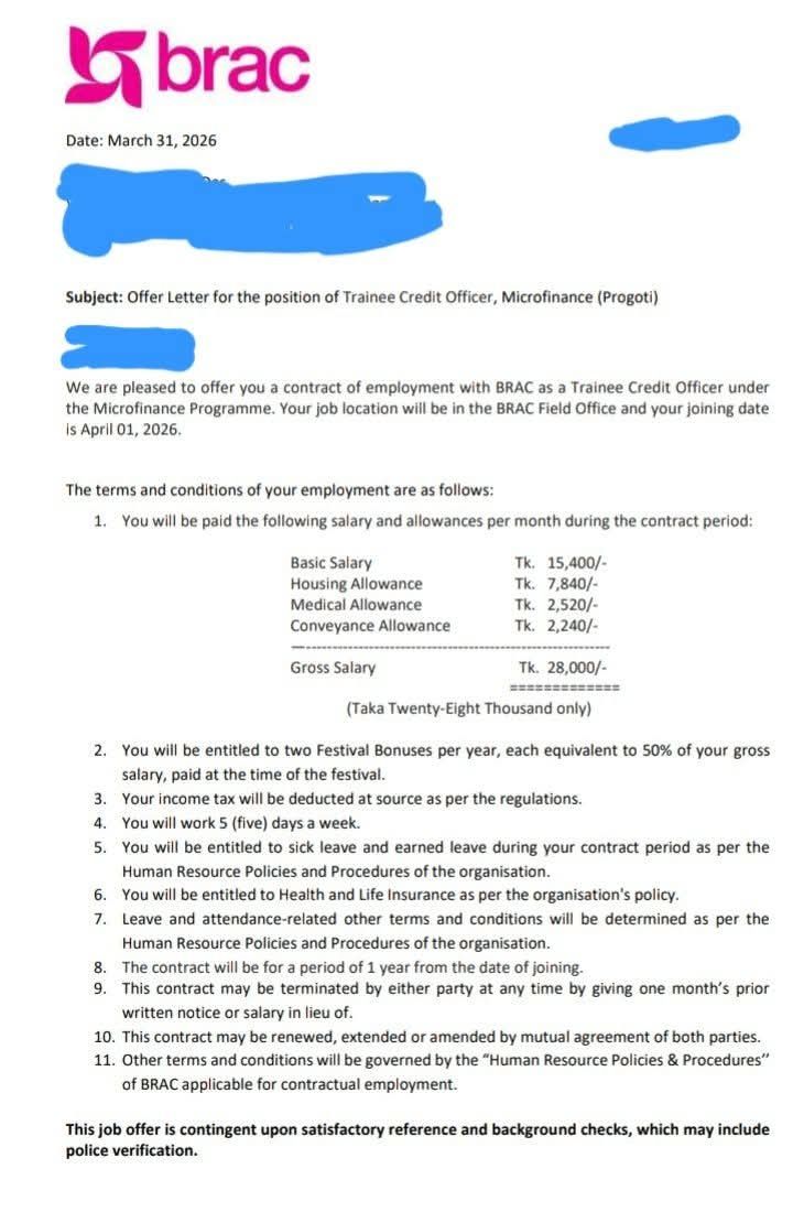 দ্রষ্টব্য: এই বেতন কাঠামোটি আপনার আপলোড করা নিয়োগপত্র (তারিখ: ৩১ মার্চ, ২০২৬) এর তথ্যের ওপর ভিত্তি করে তৈরি করা হয়েছে। ব্র্যাকের মাঠ পর্যায়ের (Field Office) কর্মকর্তাদের জন্য এটি একটি আকর্ষণীয় প্রারম্ভিক বেতন কাঠামো।