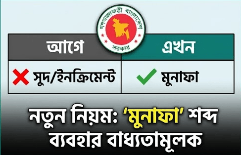 সরকারি কর্মচারীগণের ভবিষ্য তহবিলের (GPF ও CPF) হিসাব রক্ষণ এবং এ সংক্রান্ত সকল দাপ্তরিক কাজে এখন থেকে ‘সুদ’ বা ‘ইনক্রিমেন্ট’ শব্দের পরিবর্তে ‘মুনাফা’ শব্দটি ব্যবহার করতে হবে। সম্প্রতি অর্থ মন্ত্রণালয়ের অর্থ বিভাগ (প্রবিধি অনুবিভাগ) থেকে জারি করা এক পত্রে এই নির্দেশনা প্রদান করা হয়েছে।