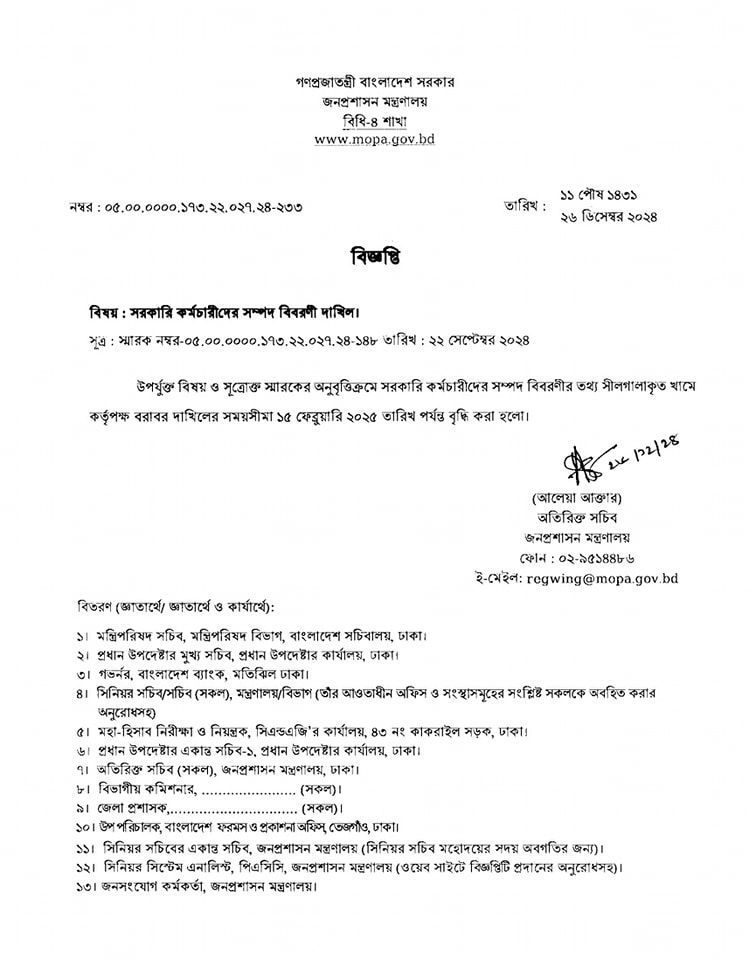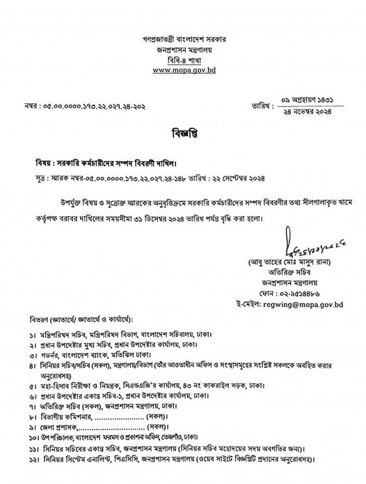 আবার নতুন তারিখ ধার্য্য কেন? জনপ্রশাসন মন্ত্রণালয়ের নির্দেশনা অনুযায়ী সরকারি কর্মচারীদের সম্পদ বিবরণী সরকারের নিকট দাখিলের নিমিত্ত প্রণয়নকৃত ফরমেট (ছক ‘ক’, ‘খ’ ও ‘গ’) মোতাবেক আপনার অনুবিভাগ/দপ্তরে কর্মরত প্রথম শ্রেণীর কর্মকর্তাদের (৯ম গ্রেড এবং তদূর্ধ্ব) সম্পদ বিবরনী একত্রিত করে প্রশাসন-৩ শাখায় এবং ১০ম গ্রেড হতে ২০তম গ্রেড পর্যন্ত কর্মরত সকল কর্মকর্তা/কর্মচারীর সম্পদ বিবরনী একত্রিত করে প্রশাসন-৪ শাখায় আগামী ১৫/০২/২০২৫ তারিখের মধ্যে প্রেরণের জন্য নির্দেশক্রমে অনুরোধ করা হয়েছে।
