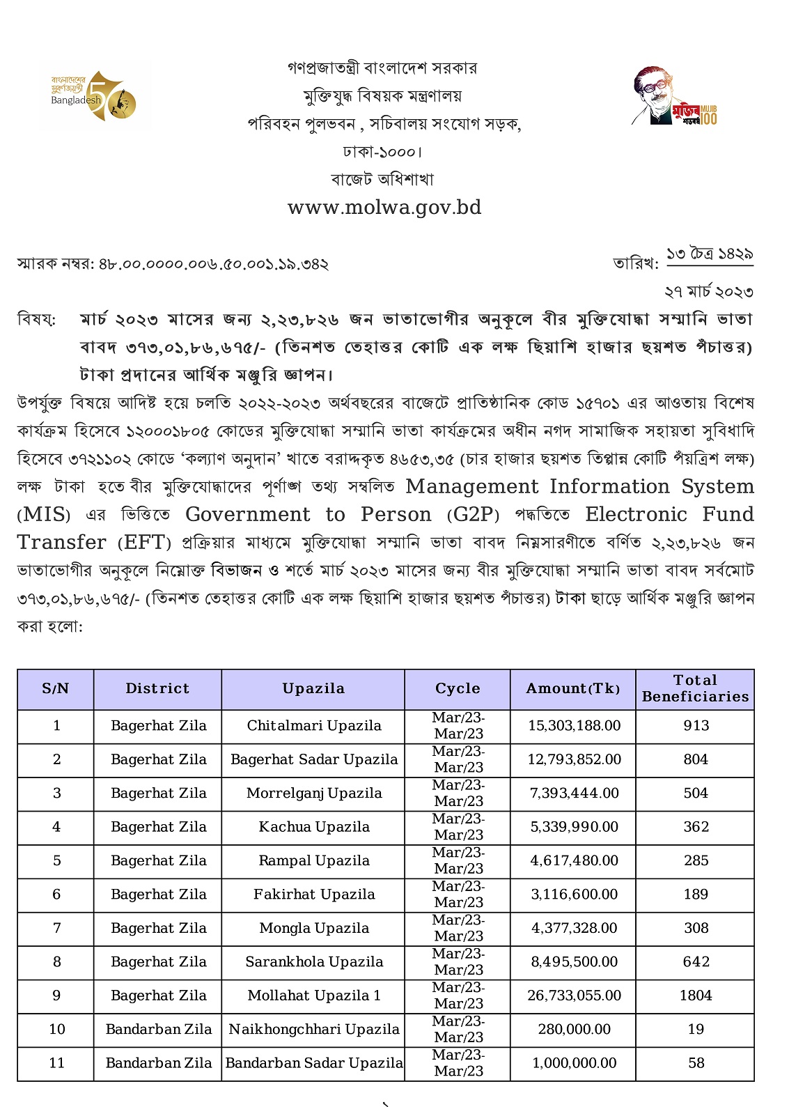 চলতি ২০২২-২০২৩ অর্থবছরের বাজেটে প্রাতিষ্ঠানিক কোড ১৫৭০১ এর আওতায় বিশেষ কার্যক্রম হিসেবে ১২০০০১৮০৫ কোডের মুক্তিযোদ্ধা সম্মানি ভাতা কার্যক্রমের অধীন নগদ সামাজিক সহায়তা সুবিধাদি হিসেবে ৩৭২১১০২ কোডে ‘কল্যাণ অনুদান’ খাতে বরাদ্দকৃত ৪৬৫৩,৩৫ (চার হাজার ছয়শত তিপ্পান্ন কোটি পঁয়ত্রিশ লক্ষ) লক্ষ টাকা হতে বীর মুক্তিযোদ্ধাদের পূর্ণাঙ্গ তথ্য সম্বলিত Management Information System (MIS) এর ভিত্তিতে Government to Person (G2P) পদ্ধতিতে Electronic Fund Transfer (EFT) প্রক্রিয়ার মাধ্যমে মুক্তিযোদ্ধা সম্মানি ভাতা বাবদ নিম্নসারণীতে বর্ণিত ২,২৩,৮২৬ জন ভাতাভোগীর অনুকূলে বিভাজন ও শর্তে মার্চ ২০২৩ মাসের জন্য বীর মুক্তিযোদ্ধা সম্মানি ভাতা বাবদ সর্বমোট ৩৭৩,০১,৮৬,৬৭৫/- (তিনশত তেহাত্তর কোটি এক লক্ষ ছিয়াশি হাজার ছয়শত পঁচাত্তর) টাকা ছাড়ে আর্থিক মঞ্জুরি জ্ঞাপন করা হয়েছে।