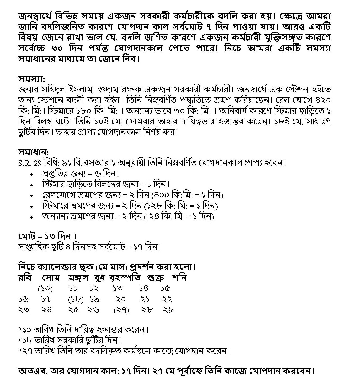 জনাব সহিদুল ইসলাম, গুদাম রক্ষক একজন সরকারী কর্মচারী। জনস্বার্থে এক স্টেশন হইতে অন্য স্টেশনে বদলী করা হইল। তিনি নিম্নবর্ণিত পদ্ধতিতে ভ্রমণ করিয়াছেন। রেল যোগে ৪২০ কি: মি:। স্টিমারে ১৮০ কি: মি: । অন্যান্য ভাবে ৩০ কি: মি: । অনিবার্য কারণে স্টিমার ছাড়িতে ১ দিন বিলম্ব ঘটে। তিনি ১০ই মে, সোমবার তাহার দায়িত্বভার হস্তান্তর করেন। ১৮ই মে, সাধারণ ছুটির দিন। তাহার প্রাপ্য যোগদানকাল নির্ণয় কর।