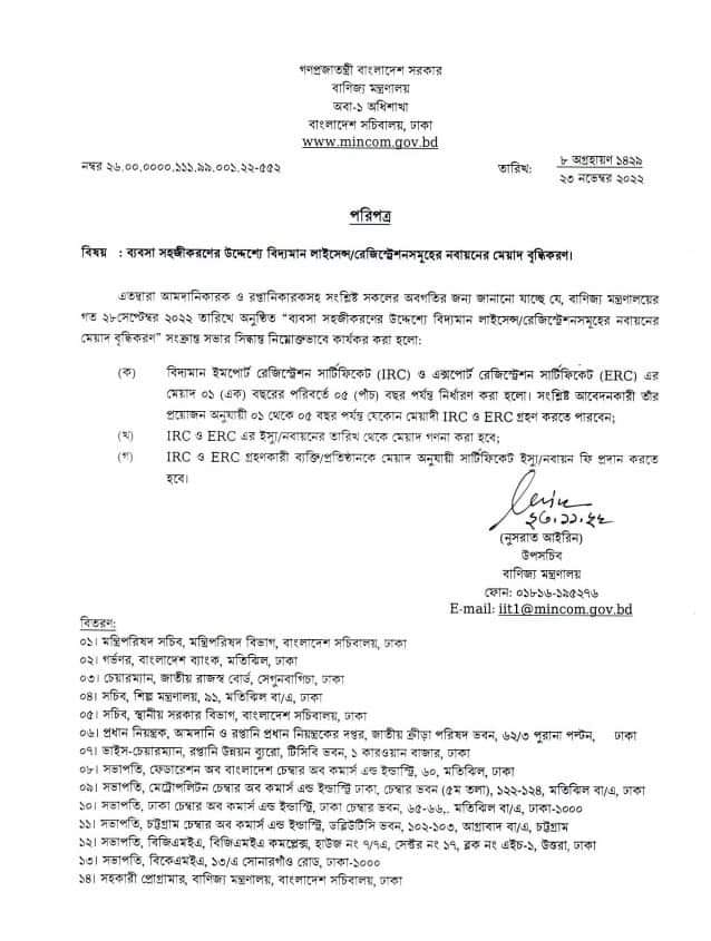 1. বিদ্যমান ইমপোর্ট রেজিস্ট্রেশন সার্টিফিকেট (IRC) ও এক্সপোর্ট রেজিস্ট্রেশন সার্টিফিকেট (ERC) এর মেয়াদ ০১ (এক) বছরের পরিবর্তে ০৫ (পাঁচ) বছর পর্যন্ত নির্ধারণ করা হয়েছে।