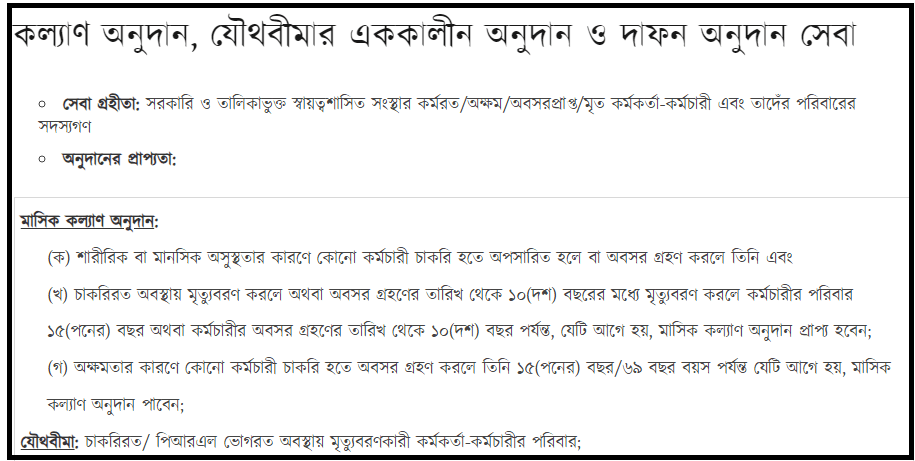 শারিরীক বা মানসিক অসুস্থ্যতার কারণে চাকরি হইতে অপসারিত হইলে বা অবসর গ্রহণ করিলে; অথবা চাকরিরত অবস্থায় মৃত্যুবরণ করিলে বা উক্ত কর্মচারী অবসর প্রাপ্তির দশ বৎসর অতিক্রান্ত হইবার পূর্বে মৃত্যুবরণ করিলে; তিনি বা তাঁহার পরিবার বোর্ডের সুপারিশের পরিপ্রেক্ষিতে সরকার কর্তৃক সময় সময় নির্ধারিত হারে পনের বৎসর অথবা উক্ত কর্মচারী যদি জীবিত থাকিতেন হারে পনের বৎসর পর্যন্ত অথবা উক্ত কর্মচারী যদি জীবিত থাকিতে তাহা হইলে তাঁহার অবসর প্রাপ্তির তারিখ হইতে পরবর্তী দশ বৎসর পর্যন্ত, যাহা পূর্বে হয়, কল্যাণ তহবিল হইতে বোর্ডের সুপারিশের পরিপ্রেক্ষিতে সরকার কর্তৃক, সময় সময় নির্ধারিত হারে অনুদান প্রাপ্য হইবেন;