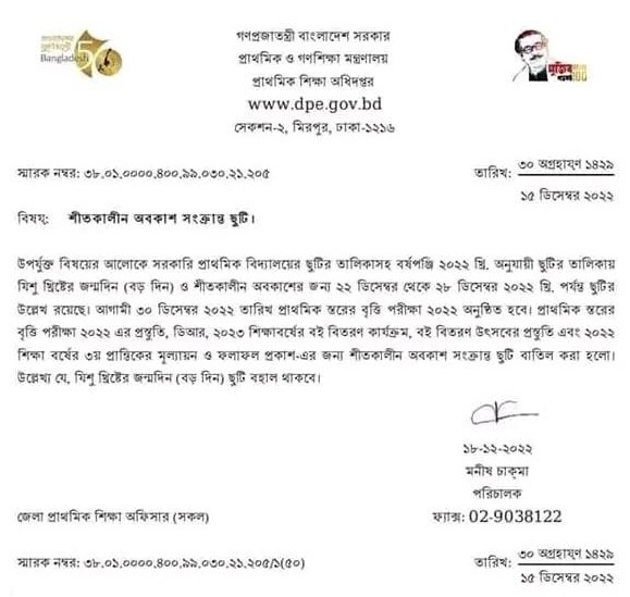 প্রাথমিক স্তরের বৃত্তি পরীক্ষা ২০২২ এর প্রস্তুতি, ডিআর, ২০২৩ শিক্ষাবর্ষের বই বিতরণ কার্যক্রম, বই বিতরণ উৎসবের প্রস্তুতি এবং ২০22 শিক্ষা বর্ষের ৩য় প্রান্তিকের মূল্যায়ন ও ফলাফল প্রকাশ-এর জন্য শীতকালীন অবকাশ সংক্রান্ত ছুটি বাতিল করা হলো। উল্লেখ্য যে, যিশু খ্রিষ্টের জন্মদিন (বড় দিন) ছুটি বহাল থাকবে।