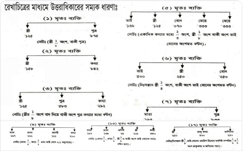 কন্যা: একজন হলে ১/২ এবং একাধিক হলে ২/৩ অংশ পান। তবে ভাই থাকলে ২:১ অনুপাতে বণ্টন হয়।
