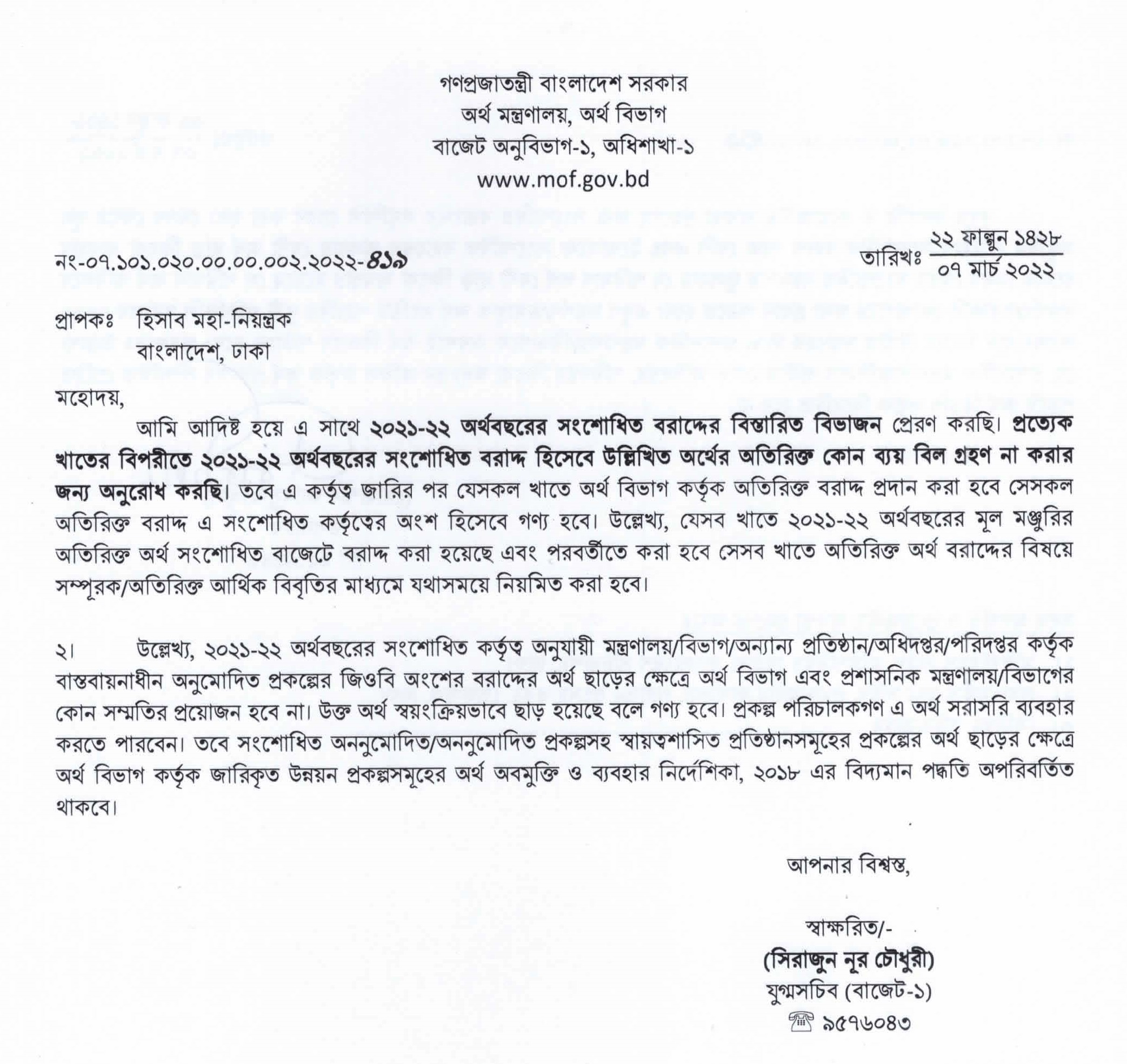 ২০২১-২২ অর্থবছরের সংশােধিত বরাদ্দের অনুলিপি অতিরিক্ত মহাপরিচালক (অর্থ), বাংলাদেশ রেলওয়ে, কন্ট্রোলার জেনারেল ডিফেন্স ফাইন্যান্স, প্রধান হিসাব রক্ষণ কর্মকর্তা, সকল মন্ত্রণালয়/বিভাগ এবং অর্থ বিভাগের সংশ্লিষ্ট সকল উপসচিব/সিনিয়র সহকারী সচিব-এর নিকট প্রেরণ করা হল। সংশােধিত বরাদ্দের বিস্তারিত অর্থনৈতিক কোডভিত্তিক বিভাজন সংশ্লিষ্ট মন্ত্রণালয়/বিভাগের সিনিয়র সচিব/সচিব এবং প্রধান হিসাব রক্ষণ ও অর্থ কর্মকর্তার নিকট প্রেরণের জন্য অর্থ বিভাগের সংশ্লিষ্ট যুগ্মসচিব/উপসচিব/সিনিয়র সহকারী সচিবদের অনুরােধ করা হলাে।