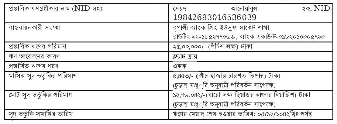 সরকারি কর্মচারীদের জন্য ব্যাংকিং ব্যবস্থার মাধ্যমে গৃহ নির্মাণ ঋণ প্রদানের লক্ষ্যে অর্থ বিভাগ কর্তৃক জারিকৃত ২৭/১০/২০২১ খ্রিঃ তারিখের ০৭,00,0000,209,22,001,21-816 নম্বর পরিপত্র অনুযায়ী বাস্তবায়নকারি সংস্হার ১২/১২/২০২২ খ্রিঃ তারিখের বিকাঢাদ/সকগনিঋ/ফ্ল্যাট ক্রয়/২০২২/২৬ নং স্মারকে প্রস্তাবিত ঋণগ্রহীতার অনুকূলে শর্তাবলি প্রতিপালন সাপেক্ষে ছকে উল্লিখিত তথ্য অনুযায়ী ঋণ প্রদানের বিষয়ে নির্দেশক্রমে সম্মতি এবং সুদ ভুর্তকি প্রদানের সাময়িক মঞ্জুরি জ্ঞাপন করা হয়েছে। যদি ব্যাংক গৃহ নির্মাণ ঋণের সুদের হার ৯% ধার্য করে থাকে তবে সরকার ৫% ভর্তুকী দিবে এবং অবশিষ্ট ৪% গ্রাহক বা ঋণ গ্রহীতাকে কিস্তি হিসেবে পরিশোধ করতে হবে। সরকারি কর্মচারীদের হাউজ বিল্ডিং লোন ২০২৩ । Government Employee House Building Loan by Rupali Bank